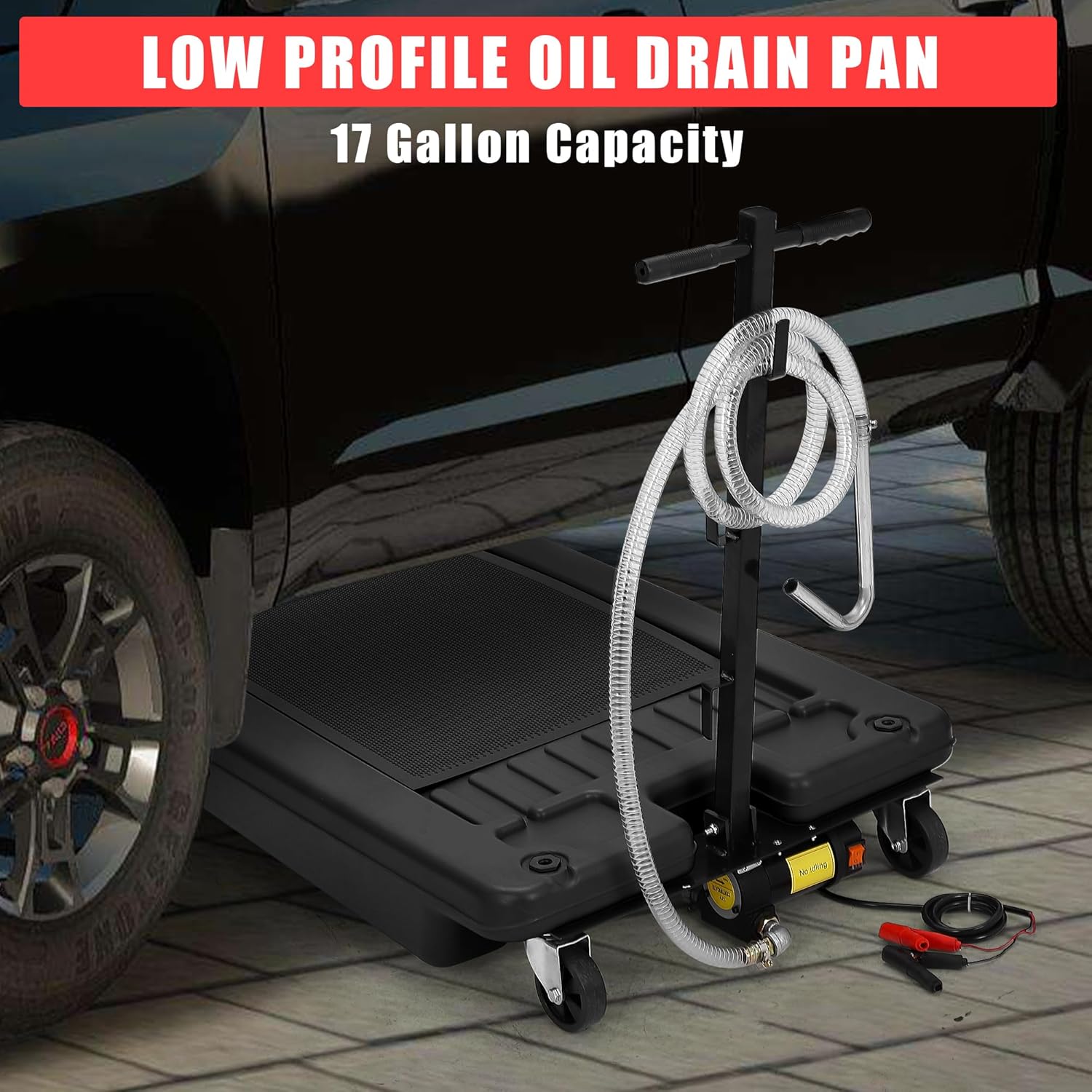 ‌17 Gal Electric Oil Drain Pan, Low Profile Mobile Oil Changing Pan with Hand Pump, 8 Ft Hose & Quick Drain Valve, Leak-Proof Design for Truck Car Motorcycle, Garage Workshop Use