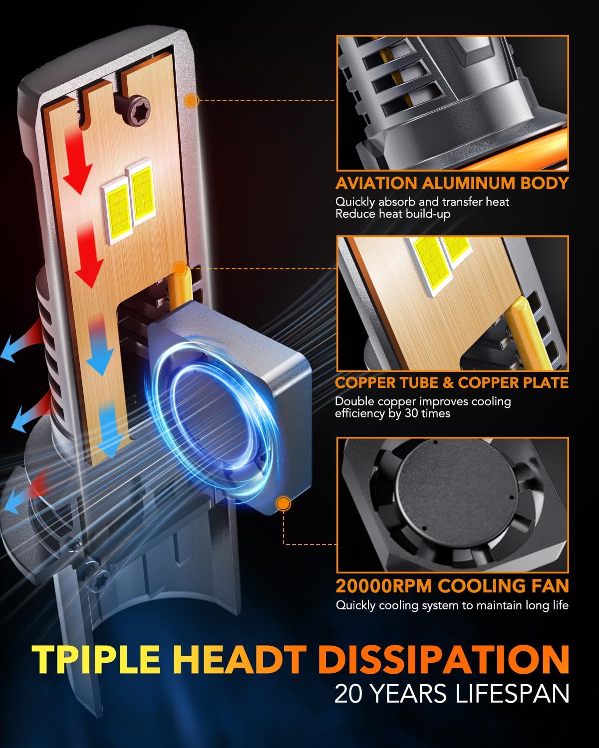 - 【20 Years Lifetime, Stable Light Output】: A long lifespan requires an efficient cooling system. OXILAM 9004 LED bulb not only uses an all-aluminum body and a 20,000-rpm ultra-high-speed silent cooling fan, but also uses high-quality constant-temperature copper plates and copper tubes, thus improving the heat dissipation effect by 3 times. And OXILAM 9004 LED bulbs won't dim over time.