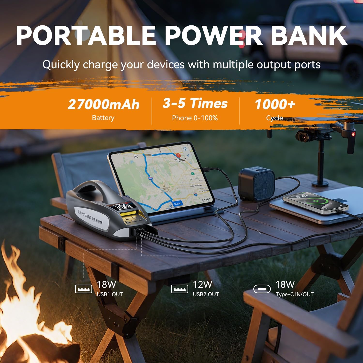 - 【6-in-1 Emergency Power Tool】More than just a jump starter—this rugged, multi-functional powerhouse is your essential road companion. It jump-starts dead batteries, inflates tires, monitors pressure, charges devices, lights up dark campsites, and even provides emergency signals. Whether you're hauling goods or heading off-grid for the weekend, it’s built to keep you moving.