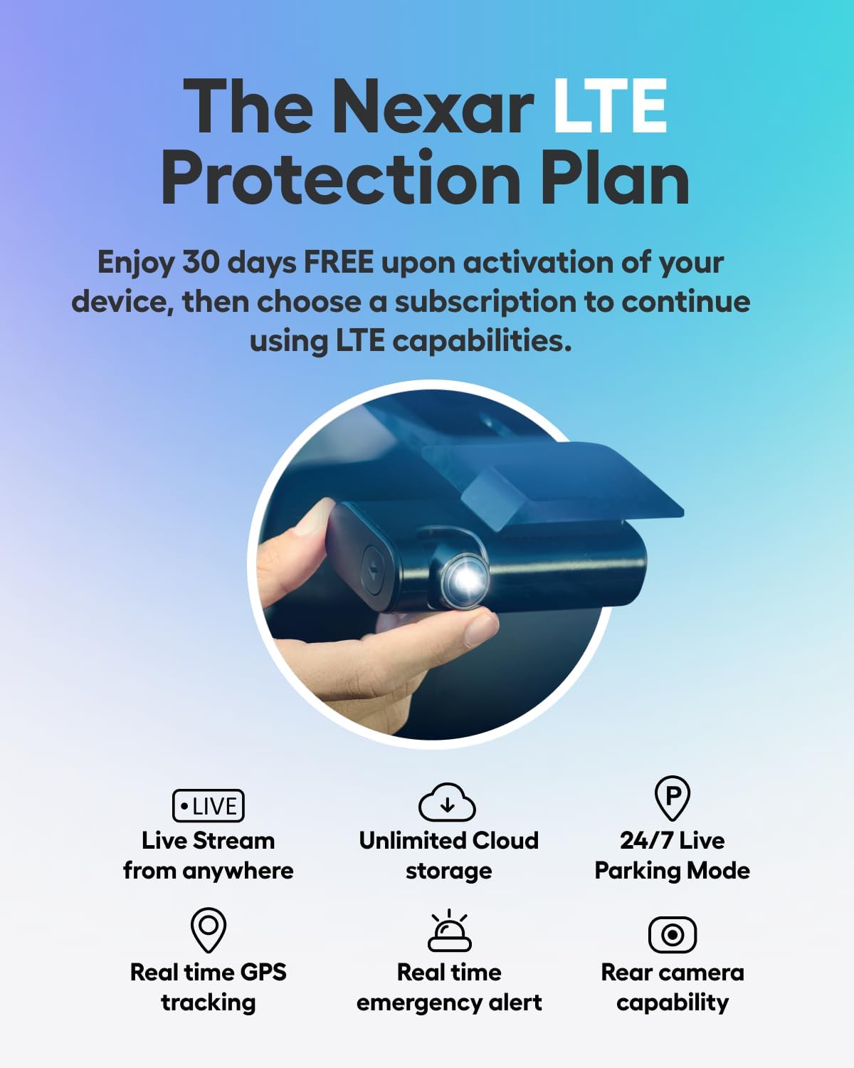 - [Smart Connectivity Features] With built-in LTE, GPS, Bluetooth 5.0 & Wi-Fi, this dash camera for cars lets you find your car, live stream remotely, and capture parking incidents. Firmware updates keep it reliable and secure with the Nexar LTE Protection Plan.