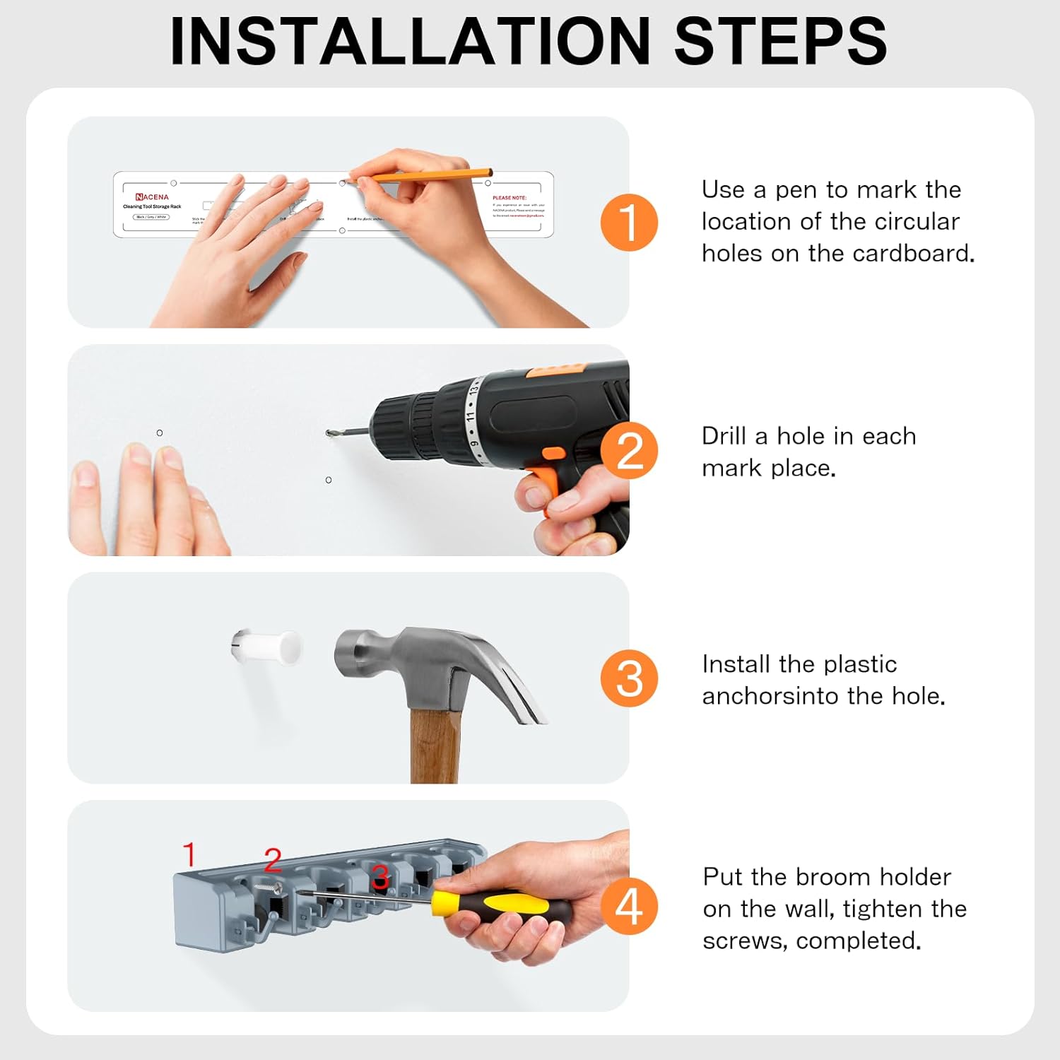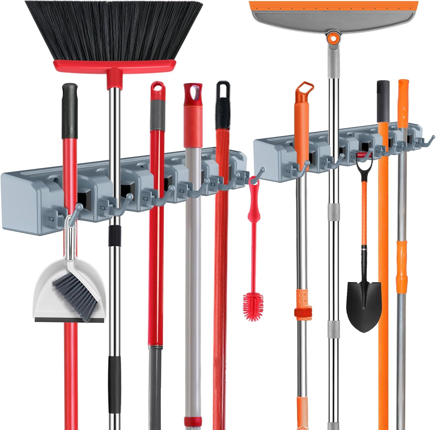 - CLEANING TOOLS STORAGE RACK: This wall mounted broom rack is suitable for storing cleaning supplies, gardening tools, kitchen utensils and hardware tools. Our broom rack is the best companion for your kitchen, garage, laundry room, keeping your work area clean and tidy