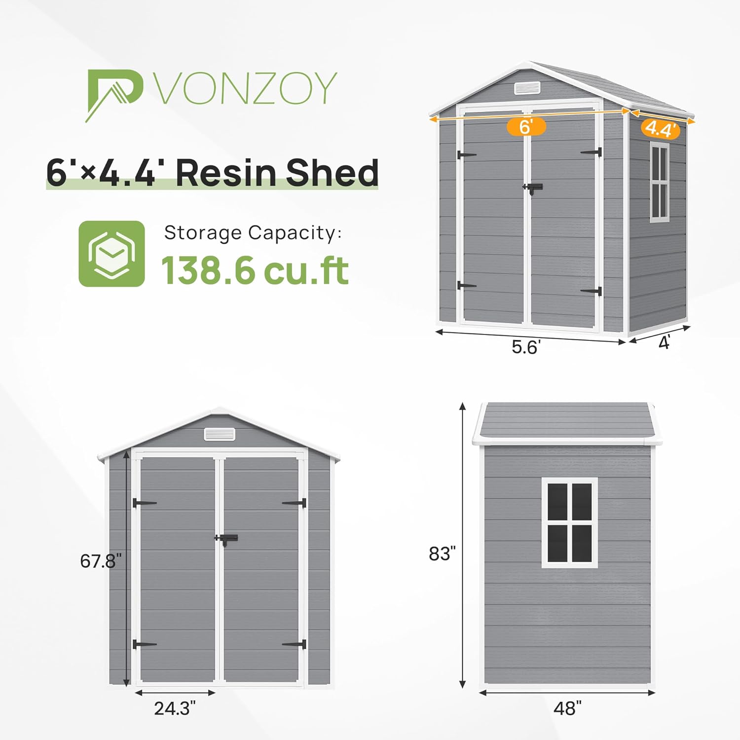 - Delivery Tip:VONZOY Resin Shed is available in many sizes for multipurpose use, perfect for outdoor backyard, garden, patio, utility room. The plastic shed can also be used as a pet house to provide a warm and safe room for your pet.Big size shed in 2 or more boxes, Please pay more attention to confirm information.