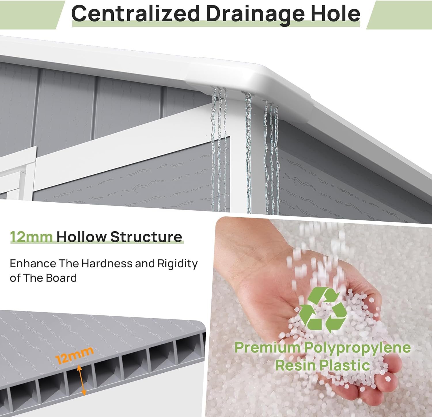 - Recyclable resin material: Compare iron and wooden, resin shed is corrosion-resistant, waterproof, rustproof and with UV protection for more than 8000 hours. Our storage shed is crafted with 12 MM hollow design polypropylene resin plastic of recyclable, less bending and puncturing, all weather conditions for customers.