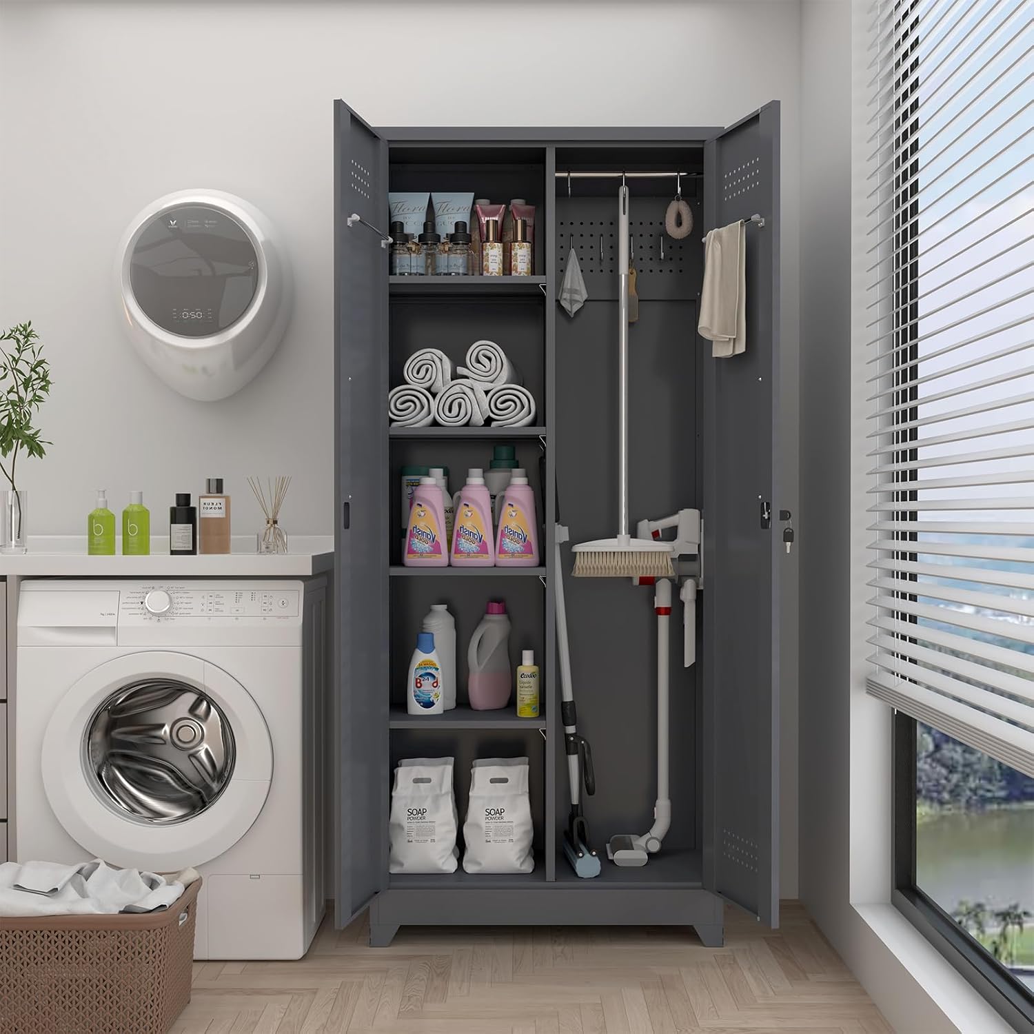 - 【User-Friendly Design】The bottom of the broom metal cabinets with locking doors and adjustable Shelves is made of stainless steel, which is corrosion-resistant and easy to clean. The ventilation holes on the panel prevent moisture and allow breathability, keeping the interior dry and reducing odors. The four standing feet enhance the stability of the cabinet and make it easier to clean underneath.