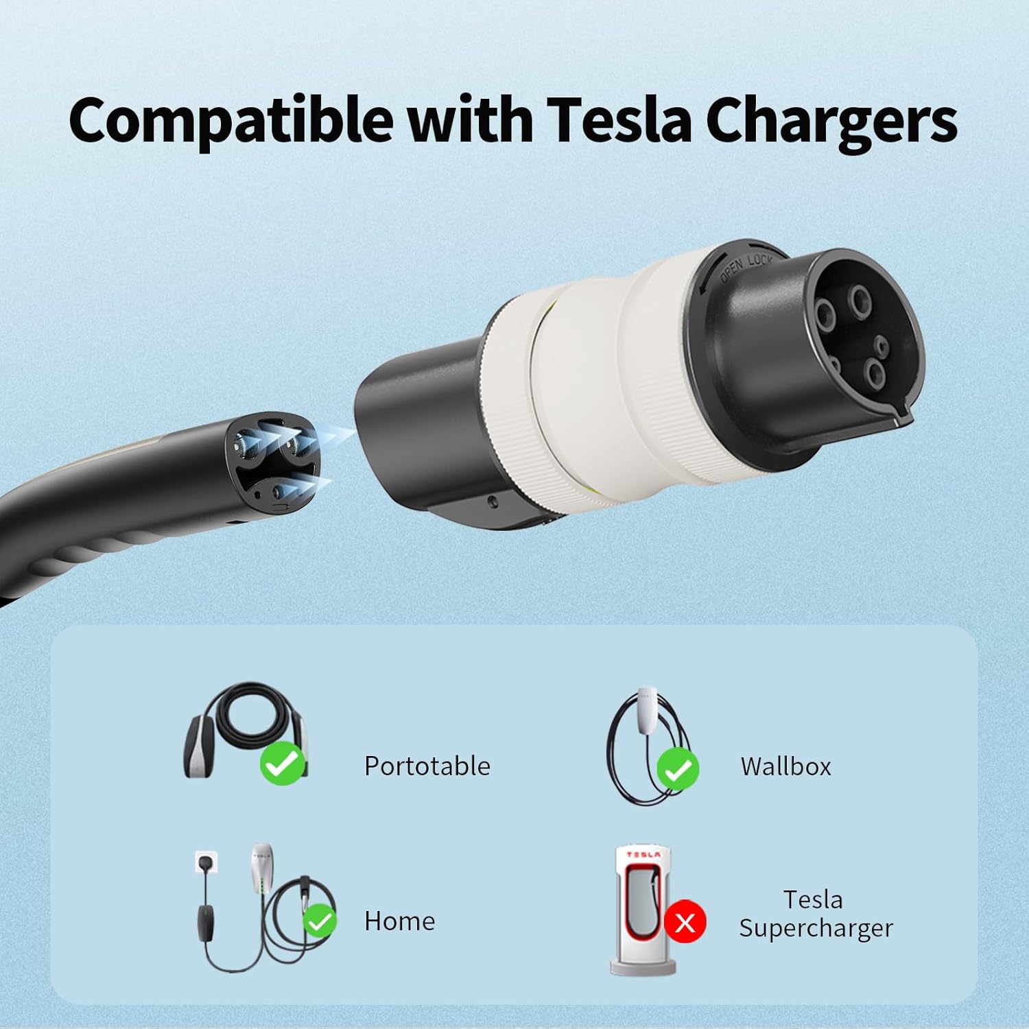 - ăCompatibilityăTesla to J1772 adapter perfectly matches Tesla's full range of charging equipment (including wall chargers, destination chargers and mobile chargers), greatly expanding the coverage of the charging network.