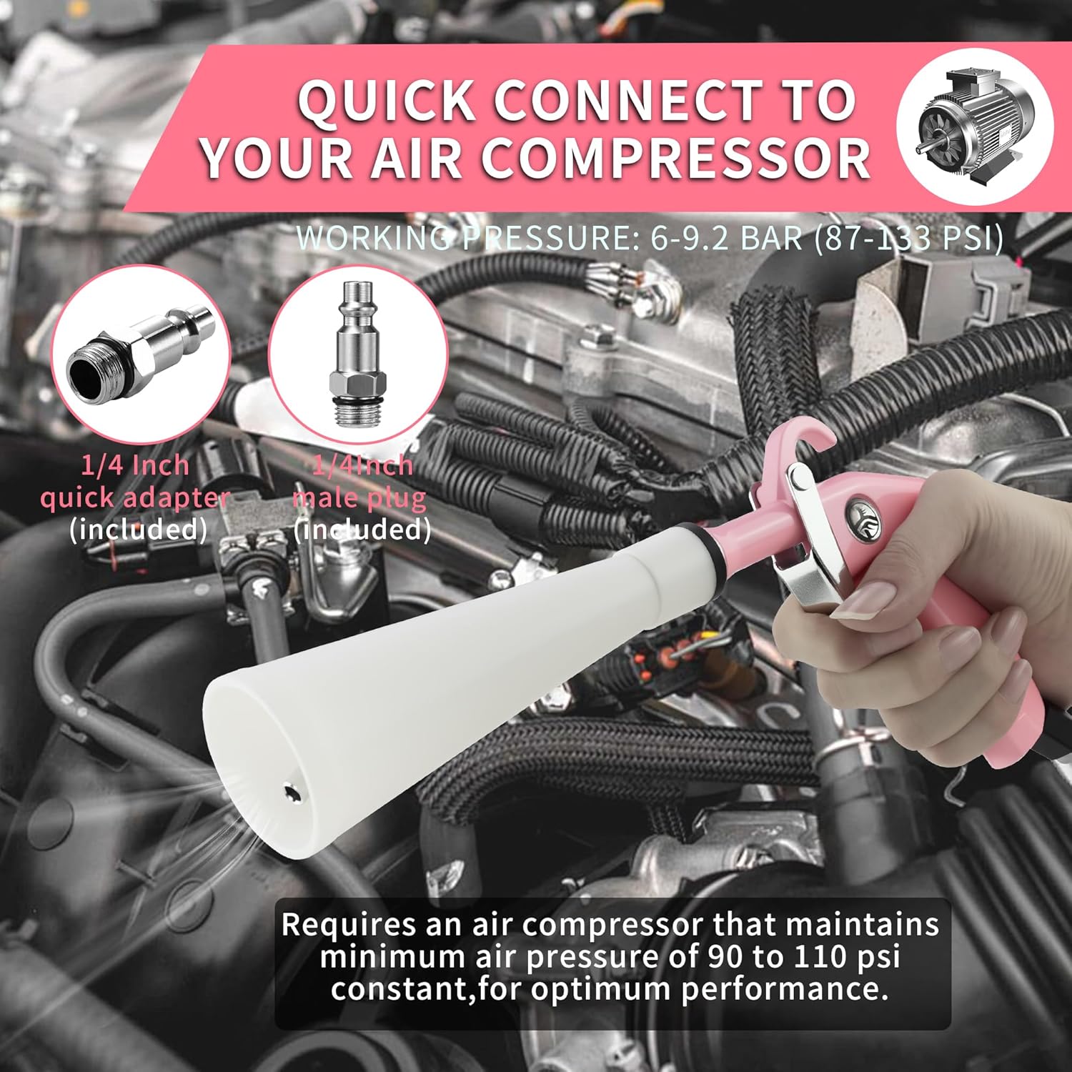 - Easy To Use: Advanced high-pressure cleaning tool, to be used with an air compressor, can quickly clean the car. Cleaning your car is a four-step process: 1. Remove the car cleaning gun from the package and check the accessories, such as adapters, brushes, etc. 2. Take the appropriate adapter and connect it to the air compressor. 3. Check that the pressure is between 6-8kgf/cm² (0.6-0.8bar), do not exceed 10kgf/cm².3. Keep the car cleaning gun at a distance of 1-10 centimeters from the object to be cleaned.4. Keep it away from children, and do not point it at people during use.