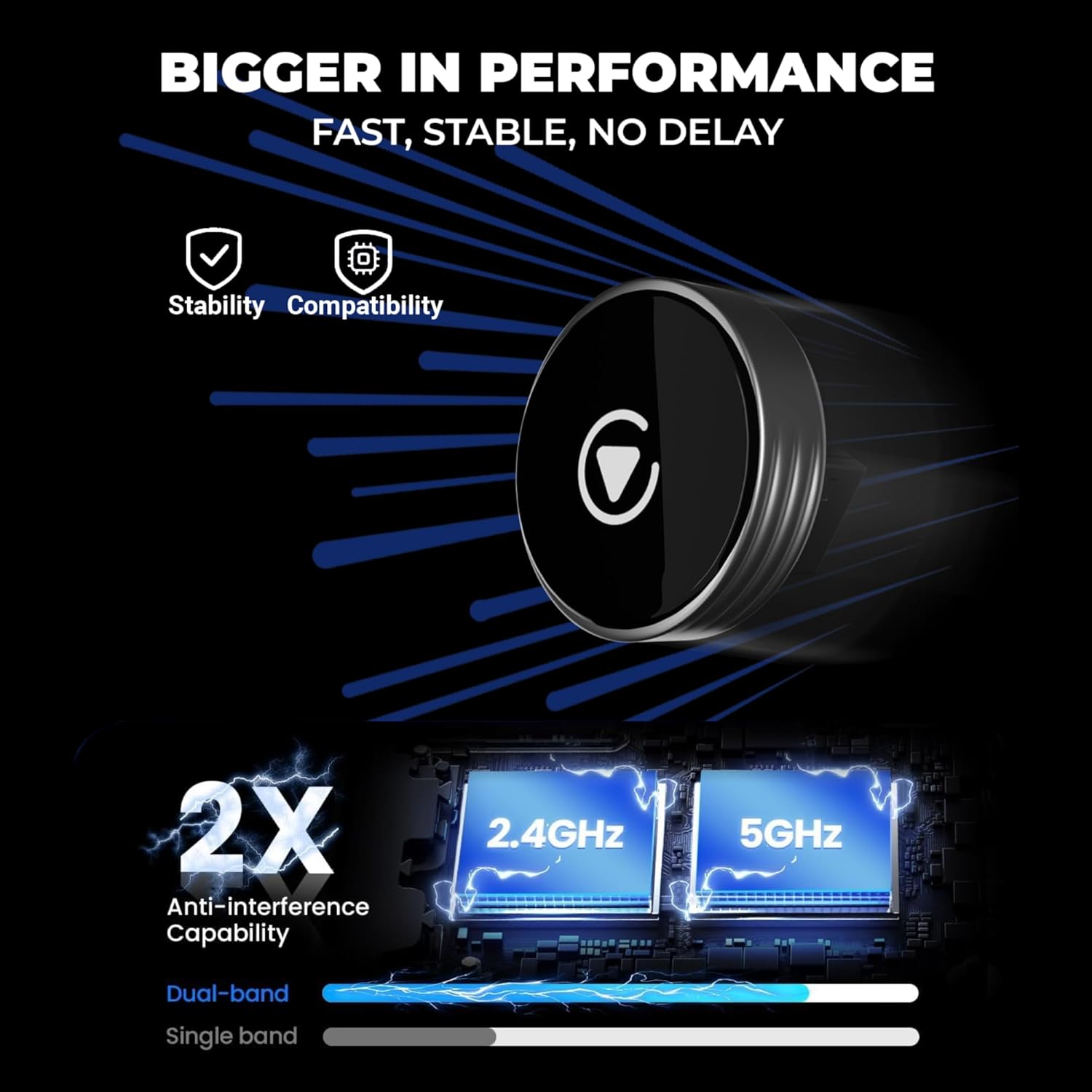 - π Dual-Band Super Performance β Featuring a 2.4GHz + 5GHz dual-band chipset and upgraded 8-core processor for 100% improved performance, our adapter ensures enhanced stability and near-zero latency. Experience lightning-fast, smooth Wireless CarPlay performance for seamless music streaming, navigation, voice assistance and hands-free calls.