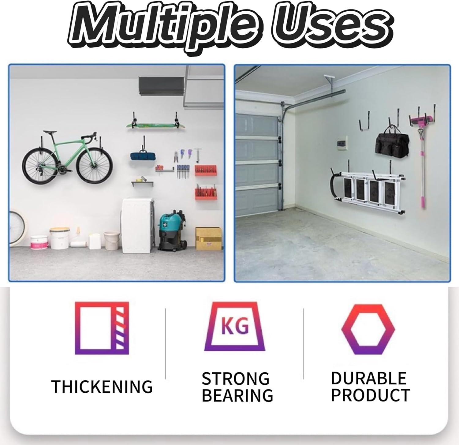 - High Quality Material: The wall-mounted garage storage hooks are made of steel pipes, reinforced and thickened to be sturdy and durable, with a powder coating.