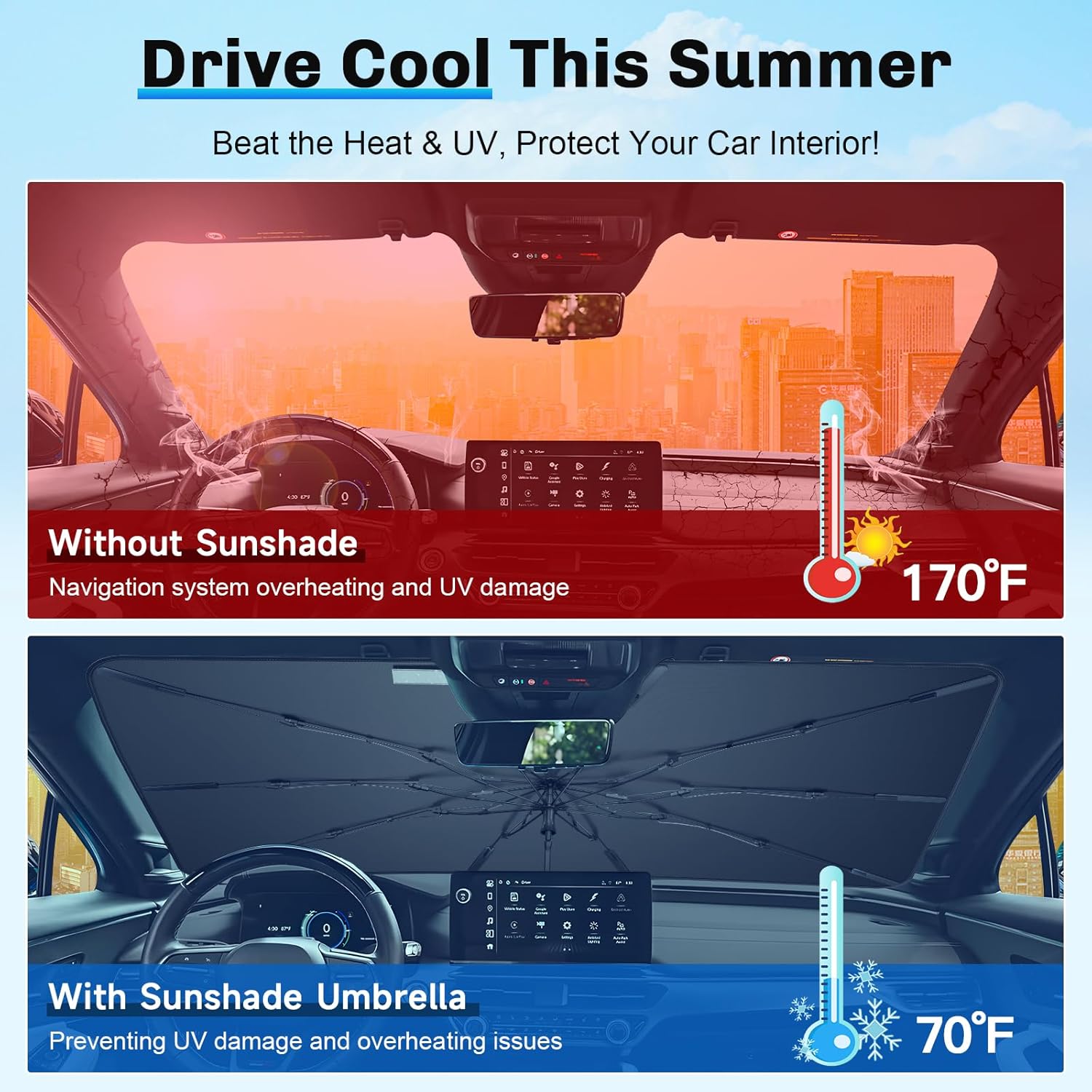 - 5. Portable & Universal Fit: Folding to umbrella size, easy to store and carry. Compatible with 2025 Lyriq/Prologue/Rogue/Ariya/Ioniq 6/Blazer EV/ZDX/GV60/EV6, it provides adjustable coverage and adapts to most windshields, with slight adjustments for a better fit
