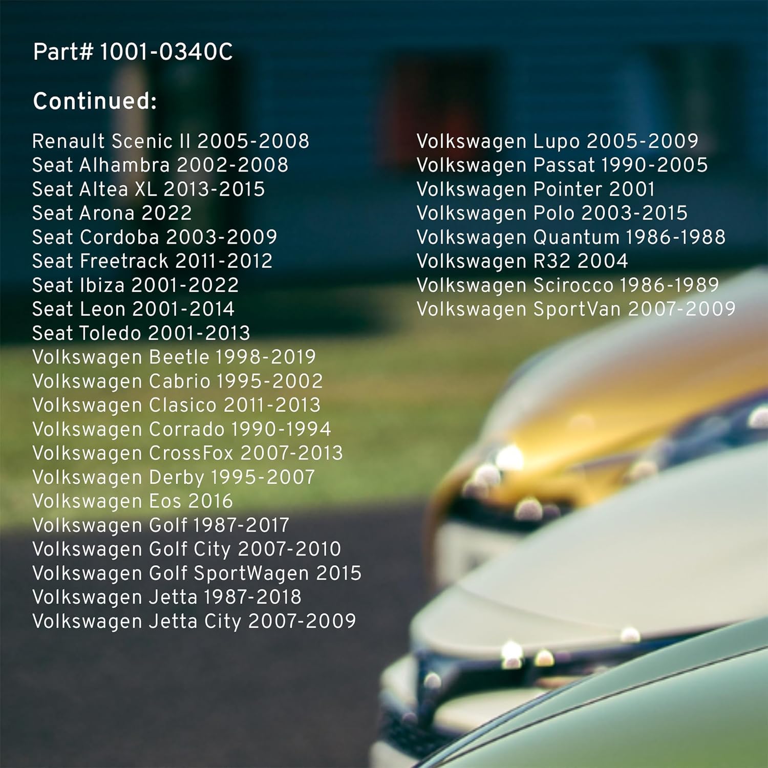 - FITMENT LIST: 1986-2019 PEUGEOT VOLKSWAGEN AUDI RENAULT SEAT (1001-0340C) Verify Fitment using AmazonConfirmedFit tool.