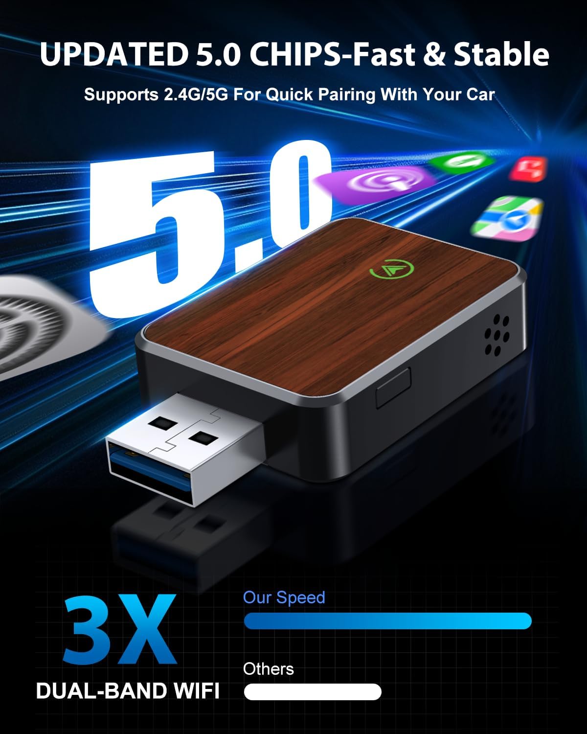 - Faster 5GHz WiFi Connection: Engineered with advanced 5GHz WiFi, this adapter delivers faster data speeds, reduced signal interference, and ultra-low latency. Whether you're streaming music, navigating, or taking calls, the connection stays reliable and smooth. Say goodbye to repeated reconnections, audio delays, or lag—this adapter ensures a wireless link that just works.