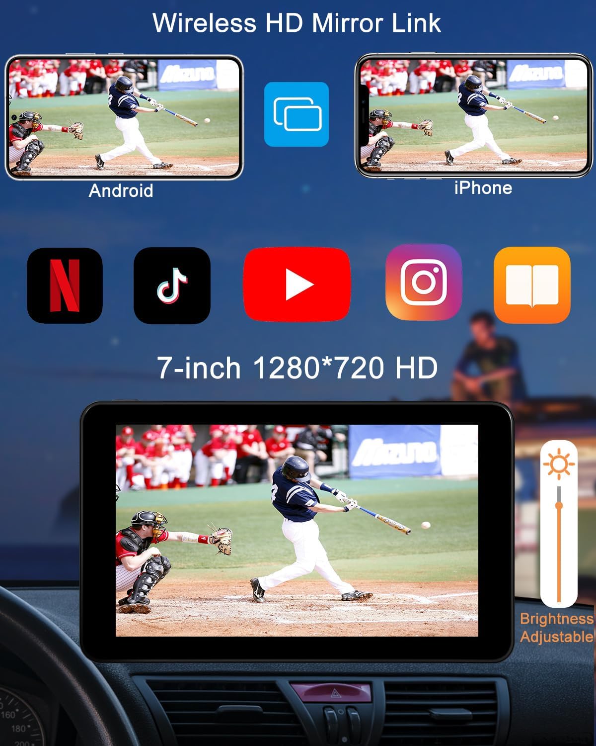 Compatible Wireless Apple CarPlay Android Auto Car Screen, 7 Inch HD Bluetooth Screen Protable Car Stereo Naivgation Music Video Player Mirrorring, Siri, AirPlay, AUX, Voice Assistant