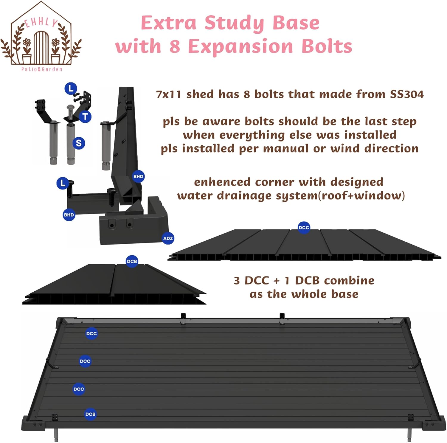 - Robust Base and Reinforced Roof: Equipped with an ultra-durable base and six additional stainless steel expansion bolts, this shed features a 16mm double-layered board and a roof reinforced with steel, providing exceptional stability and strength against the elements.