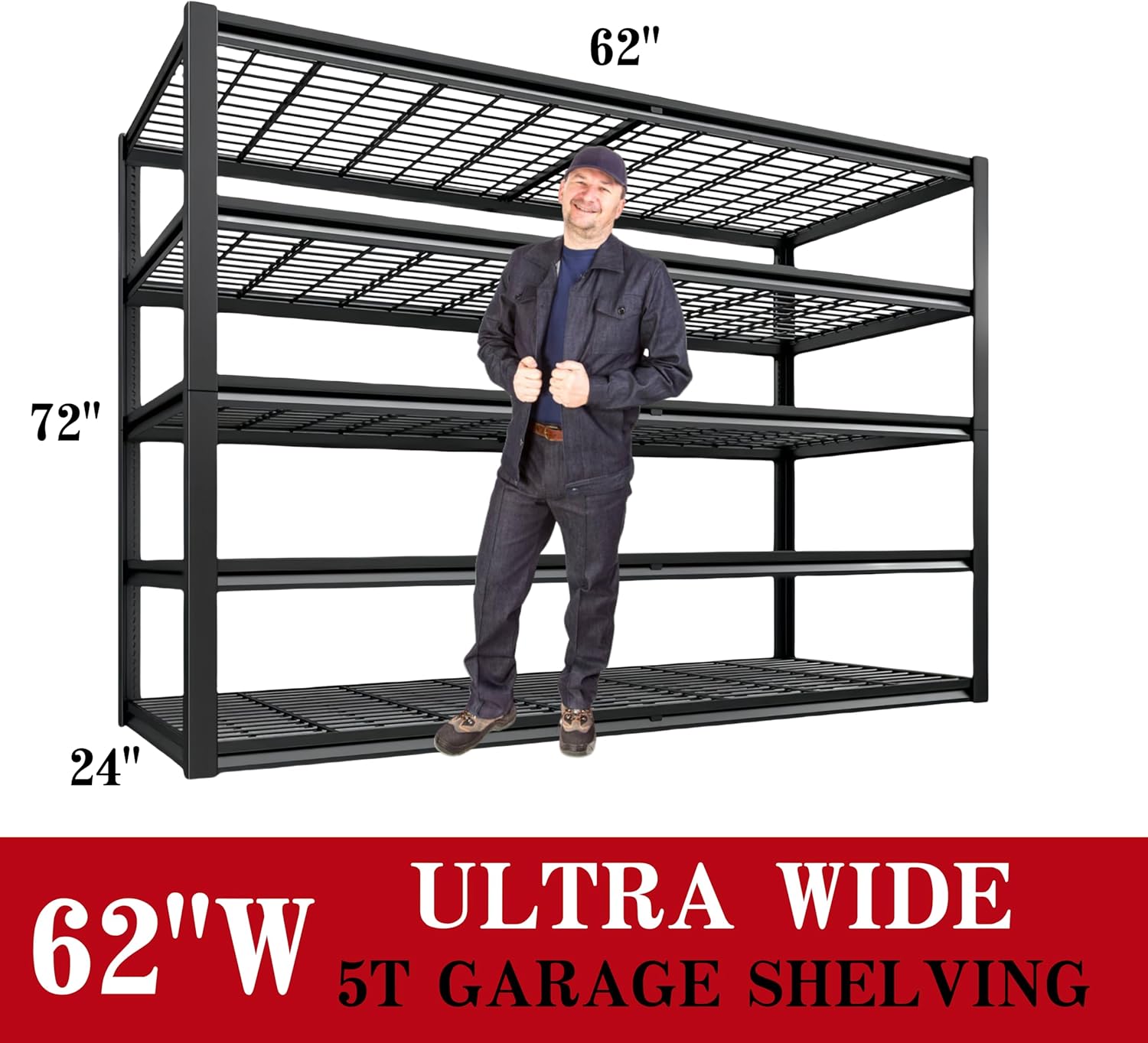 - ă62"W x 72"H x 24"D Wide Storage ShelvesăThe garage shelving heavy duty is suitable for garage, warehouse, basement, warehouse, library, etc. The 5 tier metal shelves for storage shelves not only expands your storage space, makes your home clean and orderly, it is your best choice