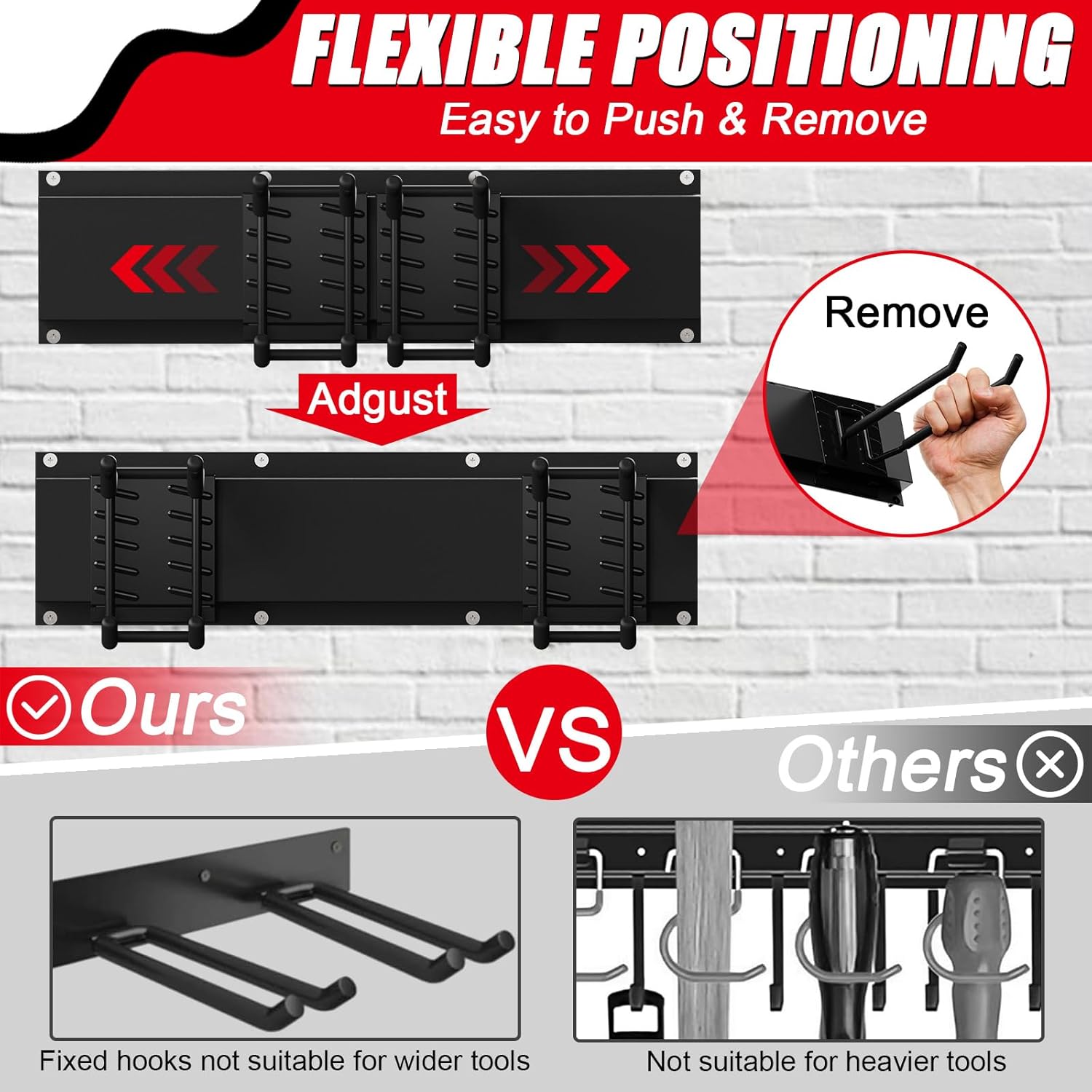 - 64-inch Adjustable Garage Wall Tool Rack: Measuring 64 inches in length, this wall-mounted organizer comes with 12 flexible hooks (4 tool hooks, 4 double-layer hooks, 4 single hooks) and 4 sliding rails. The hooks glide smoothly along the rails, letting you rearrange them in seconds to fit tools of all sizes. Maximize vertical space and save floor space.