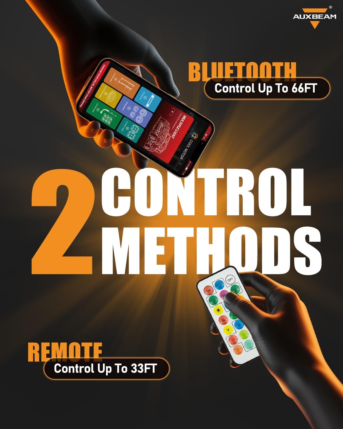 - APP & REMOTE CONTROL:‌ Take full command via the ‌Cool Motor Bluetooth App‌ or ‌the included RF remote!‌ Choose from ‌180 dynamic lighting modes‌, sync lights to ‌music beats (Music Mode)‌, or activate ‌voice-responsive lighting (Voice Mode)‌—where 8-pod rock lights react instantly to your ‌voice pitch and rhythm‌. Use ‌Group Management‌ to effortlessly sync multiple AUXBEAM lights compatible with Cool Motor—all from one app