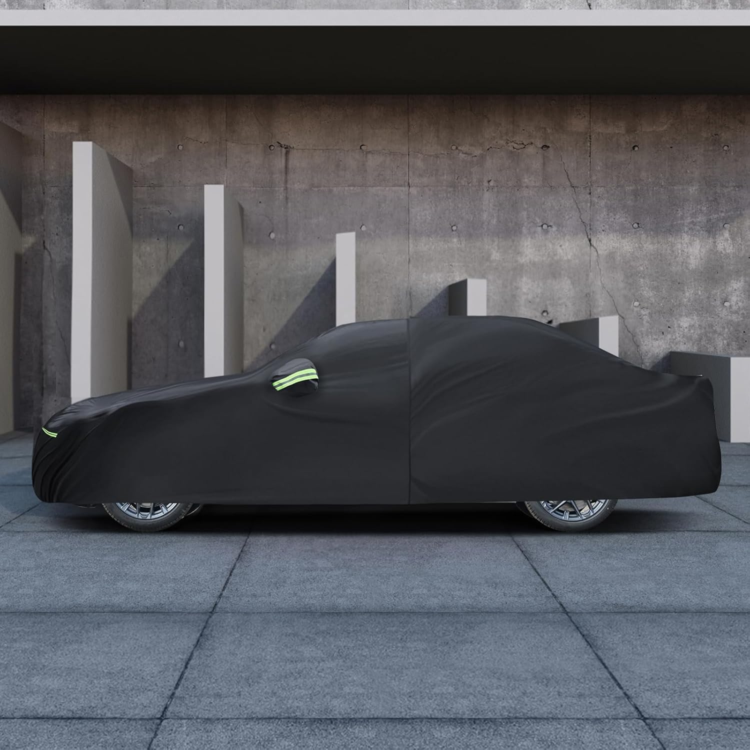 - Windproof design: All-weather waterproof car covers are specially designed to withstand strong winds. 1) Equipped with two bungee cords, it only takes a few seconds to attach to the tires on both sides, firmly covering the front and rear of the car. 2) There is a specially designed windproof belt at the bottom that runs through the middle of the car to ensure that the cover is not blown away. 3) Adjustable elasticated hem for easy sizing and securing the cover to the body.