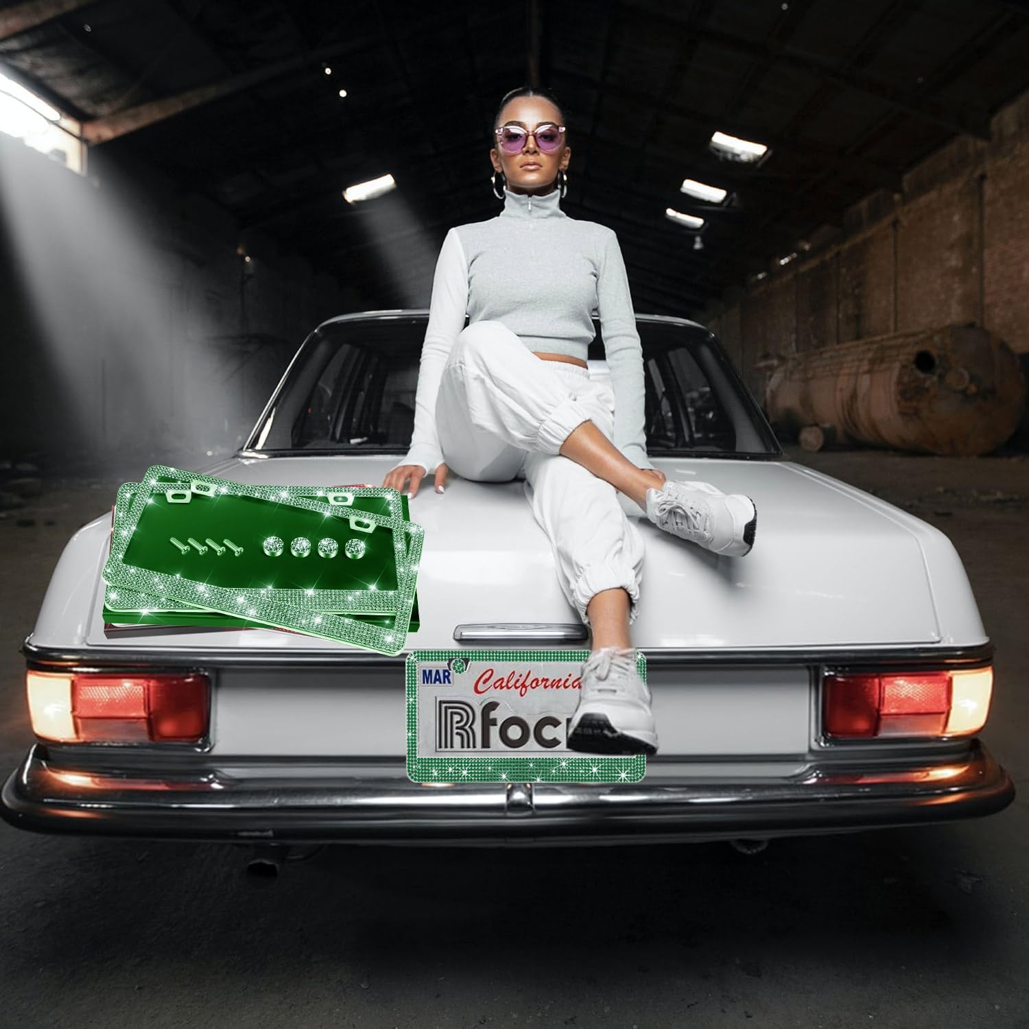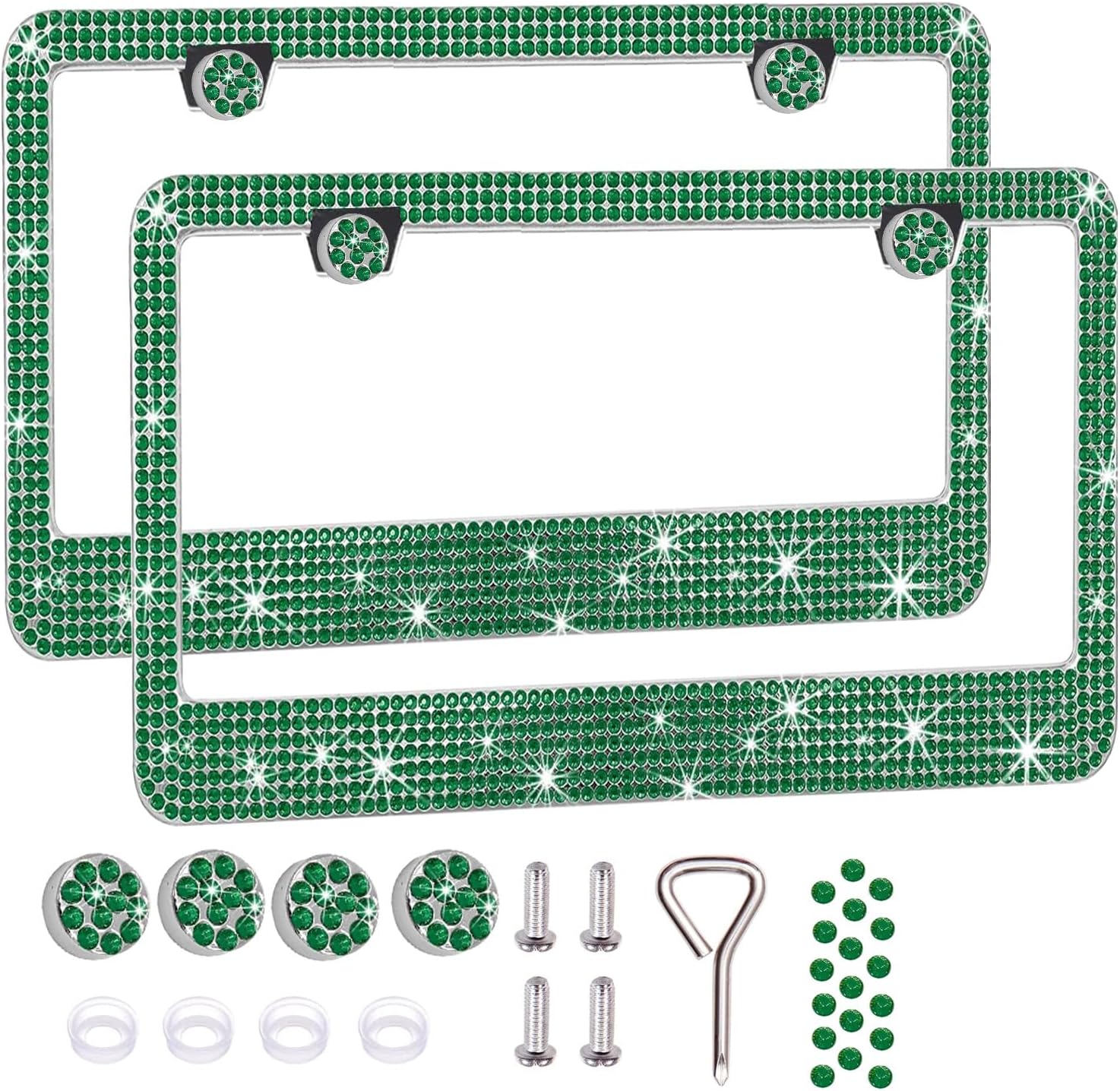2 Pack License Plate Frames for Women, Sparkly Rhinestone Diamond Car Accessories with Glitter Crystal Caps (Green(2PCS))