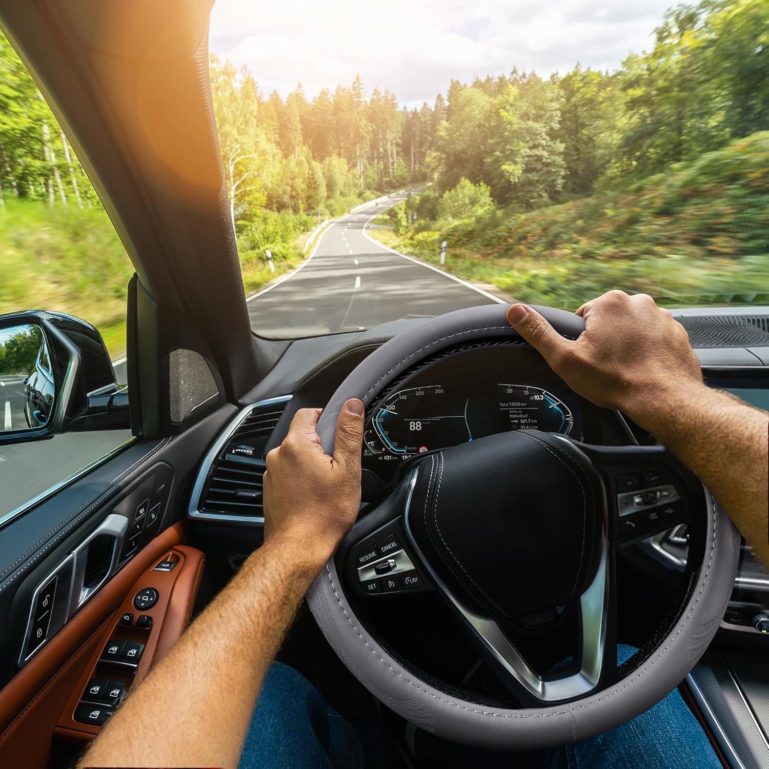【2025 Model】 Breathable Soft Leather Car Steering Wheel Cover for Men Women, Non-Slip, Comfortable,Universal 15 inches Steering Wheels, Grey
