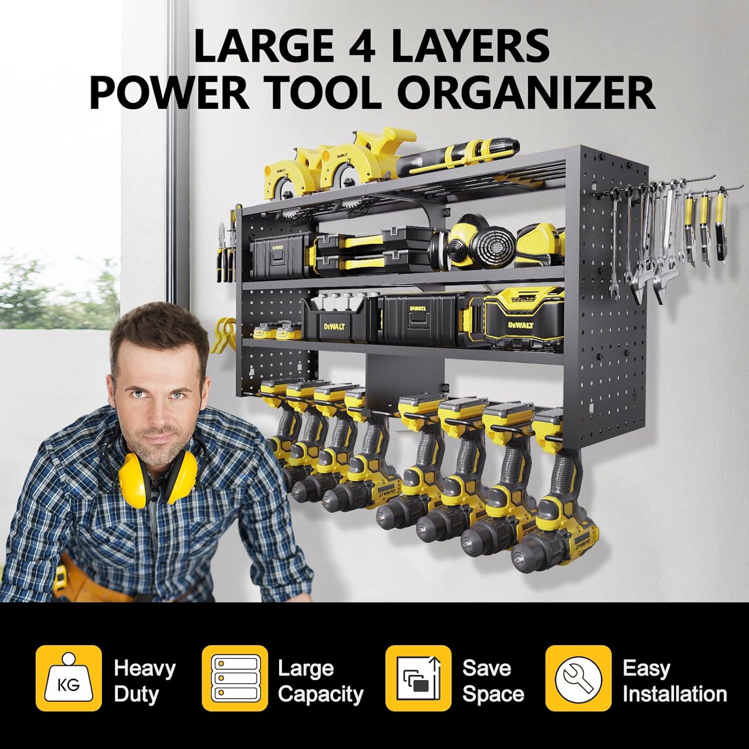 Large Power Tool Organizer Wall Mount, 4 Layer Garage Storage Cordless Tool Organizer with 8 Drills Holder, Heavy Duty Premium Metal Load 400 lbs, Ideal Garage Organization Gifts for Men
