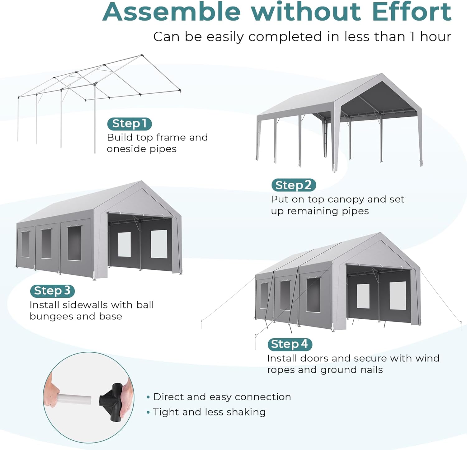 - Quick and Easy Assembly: The portable garage boasts easy connecting poles that require no complicated tools for quick assembly. The numbered components and instructions make it straightforward to follow step-by-step. Typically, 2-3 adults can swiftly complete the setup. Besides, with the provided wind ropes and ground nails, you can reinforce the structure efficiently, ensuring you have the sturdiest car garage in no time