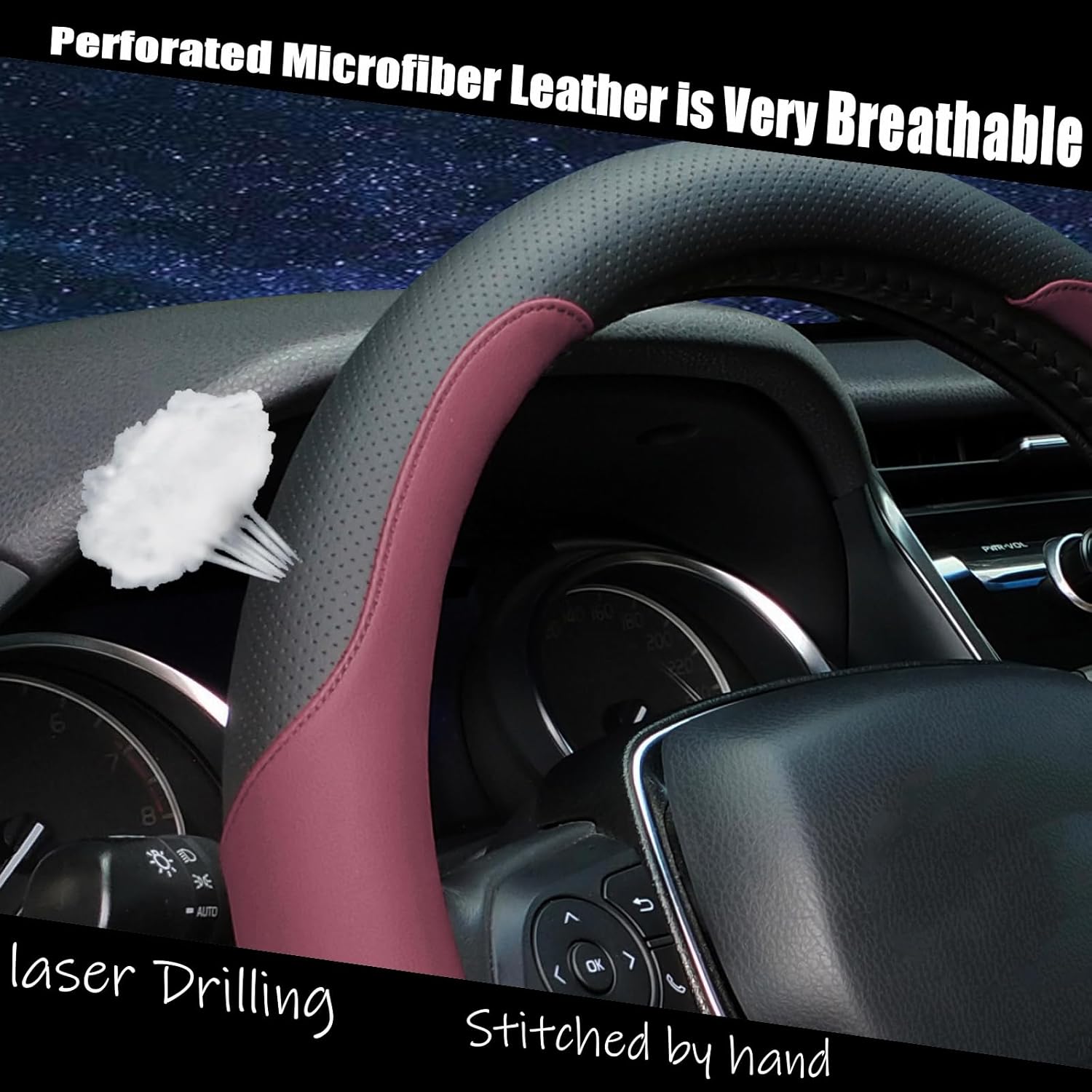 Steering Wheel Cover Standard Size Medium 14.5-15 inch, Breathable Microfiber Leather, Anti-Slip, Soft Grip, Universal Fit for Cars SUVs Trucks, Black and Burgundy