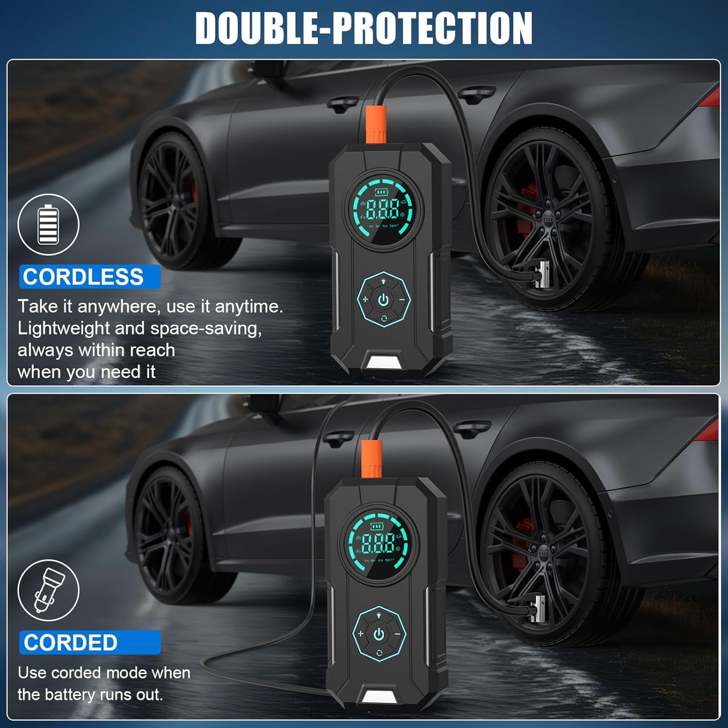 - 4 Smart Modes & Precision LCD Display: Preset car, bike, motorcycle, and ball modes for custom pressure adjustments. The sunlight-readable LCD screen ensures sharp, glare-free visibility in any lighting condition, tracking real-time PSI with unwavering accuracy. It Combined with an auto-stop function to prevent over-inflation, it guarantees reliable performance whether indoors, outdoors, or under bright ambient light.