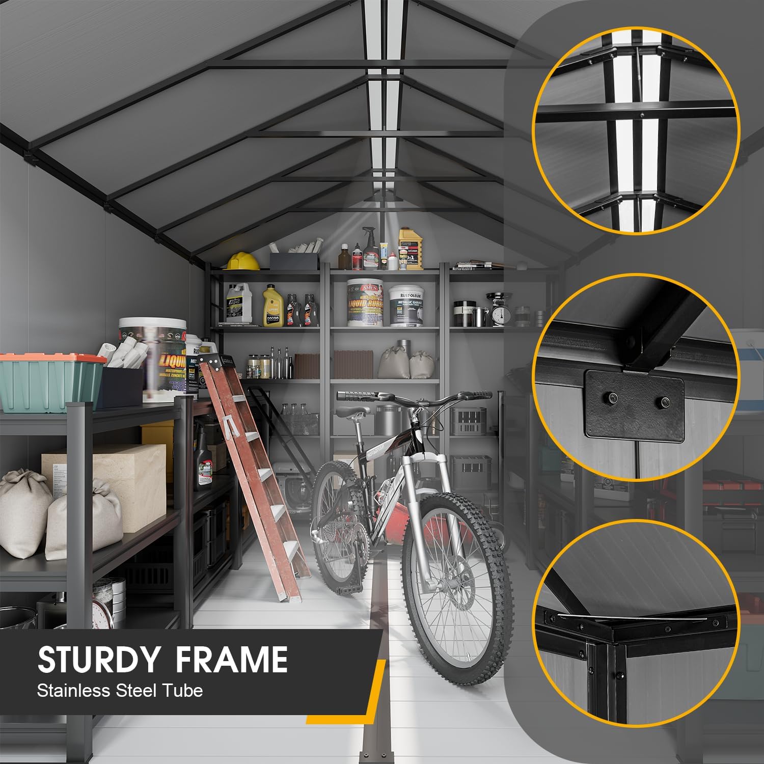 - Durable and Eco-Friendly Material: DNYKER plastic tool shed is crafted from 16mm thick double-layer PP recyclable resin panel. Unlike metal or wooden, ours won't rust, crack, or corrode. This material is waterproof, snowproof and UV-damaging