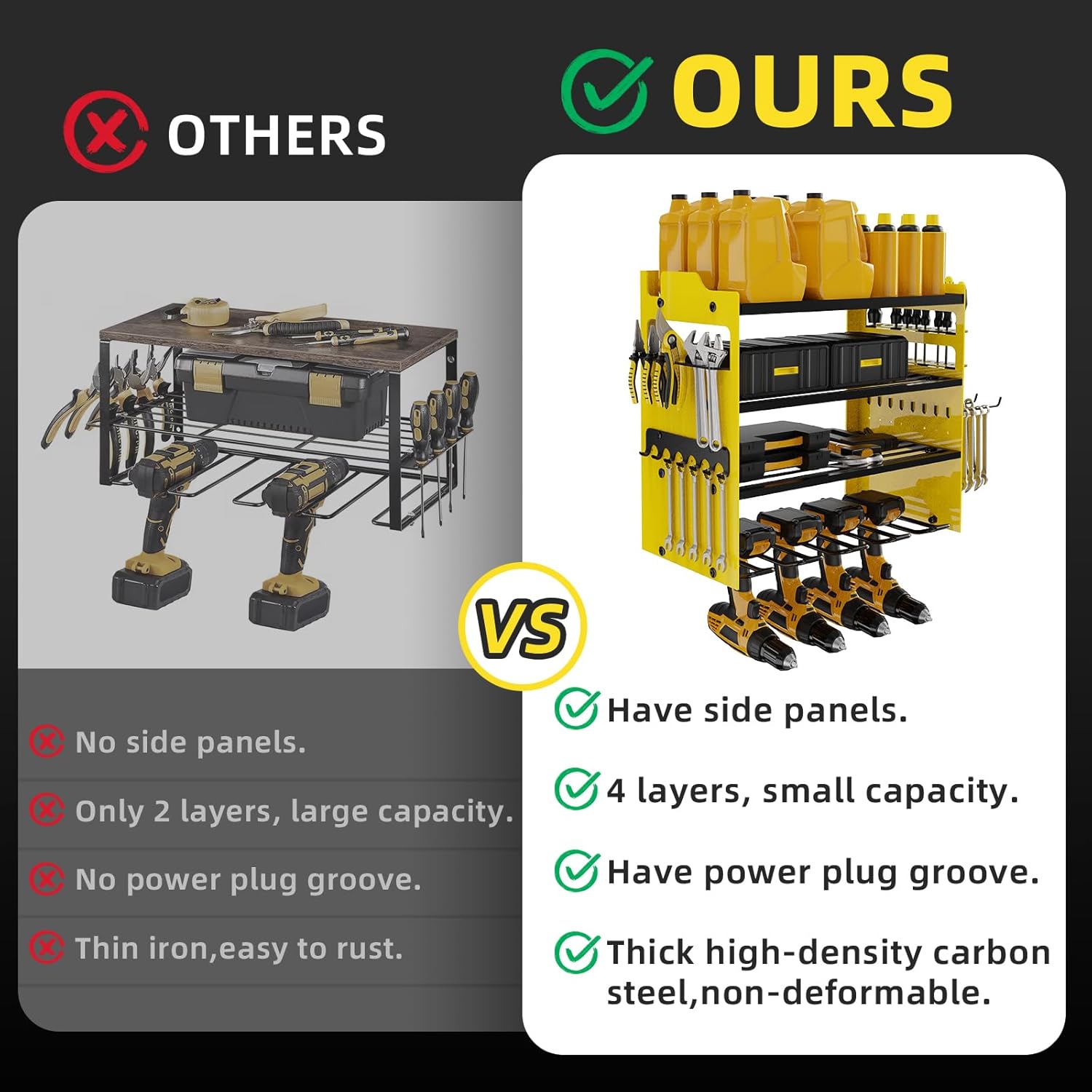 - 🔧【 LARGE CAPACITY&SIDE PLATE】This wall-mounted power tool organizer is more storage space than standard tool racks.It has 4-layer high-capacity design and 4 cordless drill holders and 2 side-plates, great for storge electric drills/power drivers/impact wrenches/mpact drills/cutters/angle grinders and other handheld power tools.The 4-layer can hold batteries, saws,wrenches,chargers and other tools, and the side racks can hold wrenches/screwdrivers/hammers/pliers, scissors, etc.
