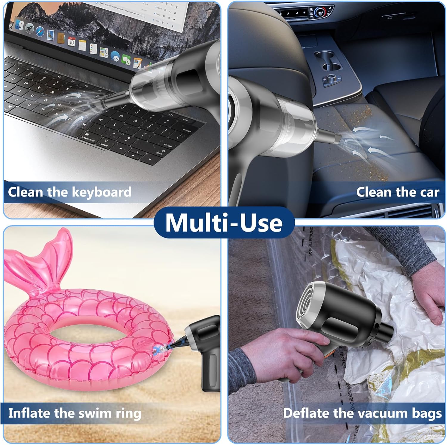 - Versatile Vacuum Cleaner: This compact vacuum is perfect for everyday cleaning, with powerful suction that effortlessly tackles dust in tight corners. One end features an air blower, ideal for clearing debris from camera lenses or piano keys, or install the nozzle on this item as a hand pump to inflate life jackets and pool floats.