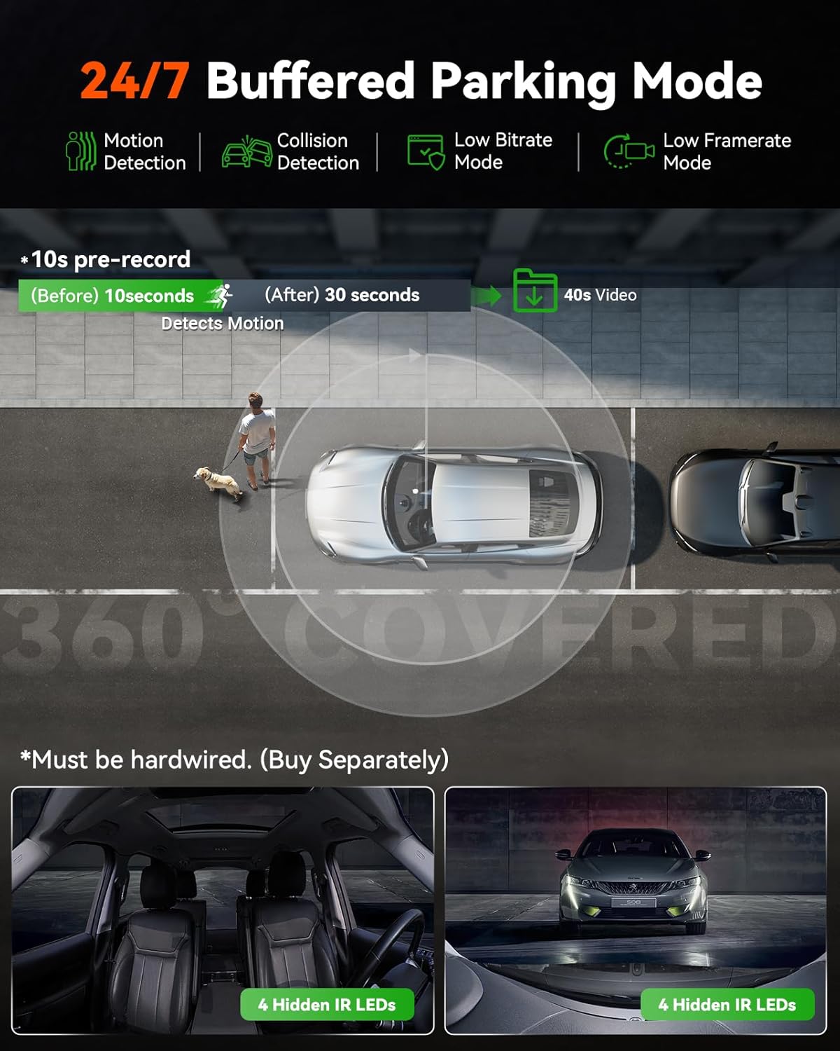 - [ 24/7 Buffered Parking Mode ] Rest easy knowing your car is protected 24/7! Any suspicious activity around your vehicle - from hit-and-runs to break-in attempts will be automatically recorded when detected under parking mode. 10s pre-recording in buffered motion detection ensures the event recorded completely, providing vital evidences for you in case of disputes. Must be hardwired. (Buy separately, ASIN: B083XB8T7T)