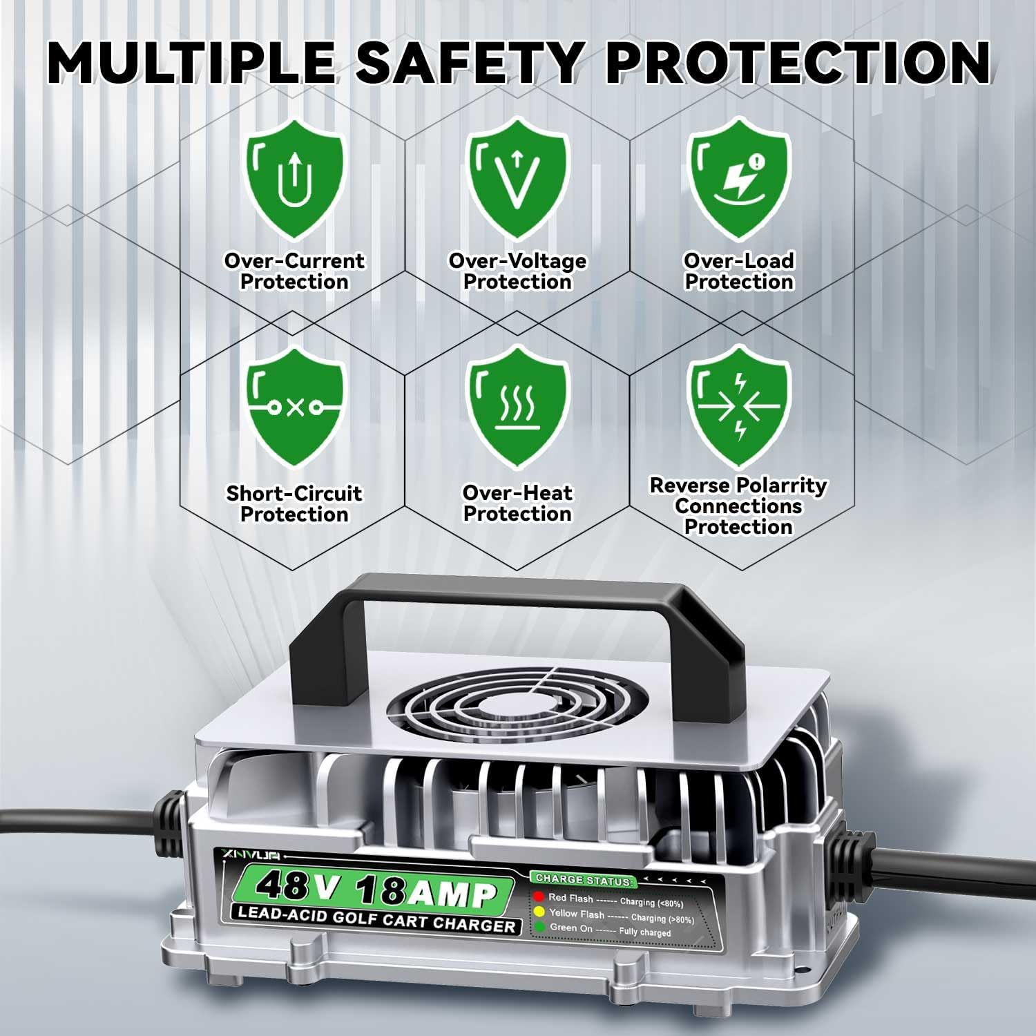 - 【Vortex Heat Dissipation Design】The 48 volt ezgo golf cart battery charger comes with a cooling fan and is designed with a vortex around it, which greatly increases the cooling efficiency and enables it to work stably.