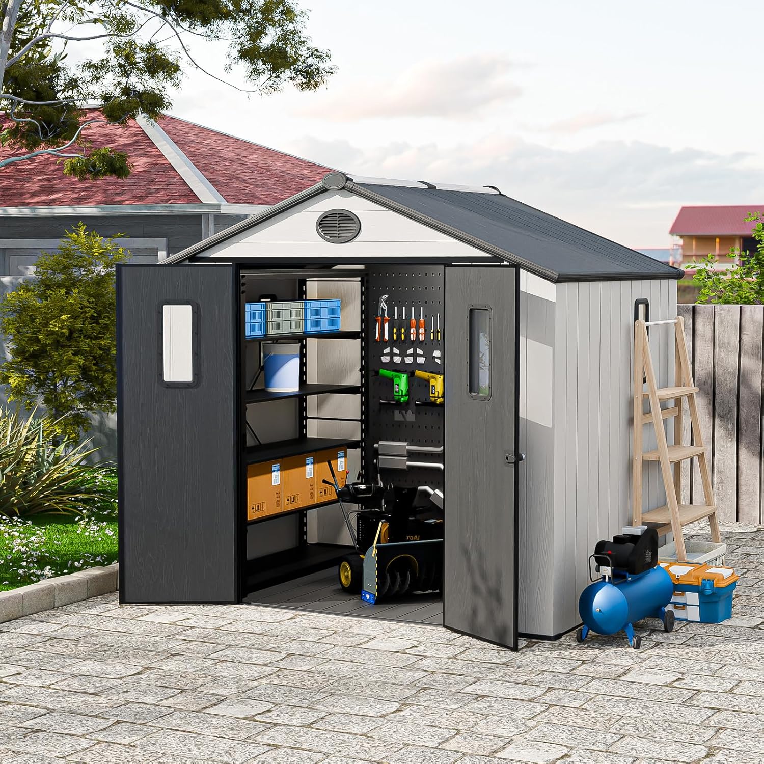 - DURABLE ALL-WEATHER CONSTRUCTION: Built with dual-wall resin panels and a reinforced steel frame, this 8x6 plastic storage shed withstands rain, sun, and snow for reliable outdoor storage year-round.