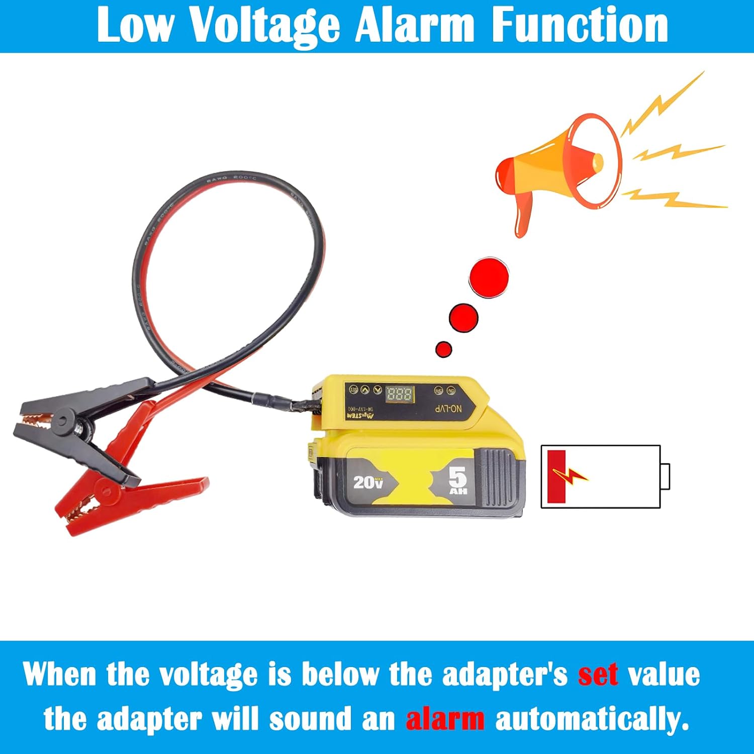 - ăLow Voltage Alarm Functionă When the voltage of the jump starter drops below the adapter's set value, this cable compatible with dewalt 20v jumper cable adapter will automatically issue an alarm to provide timely reminders and facilitate operation