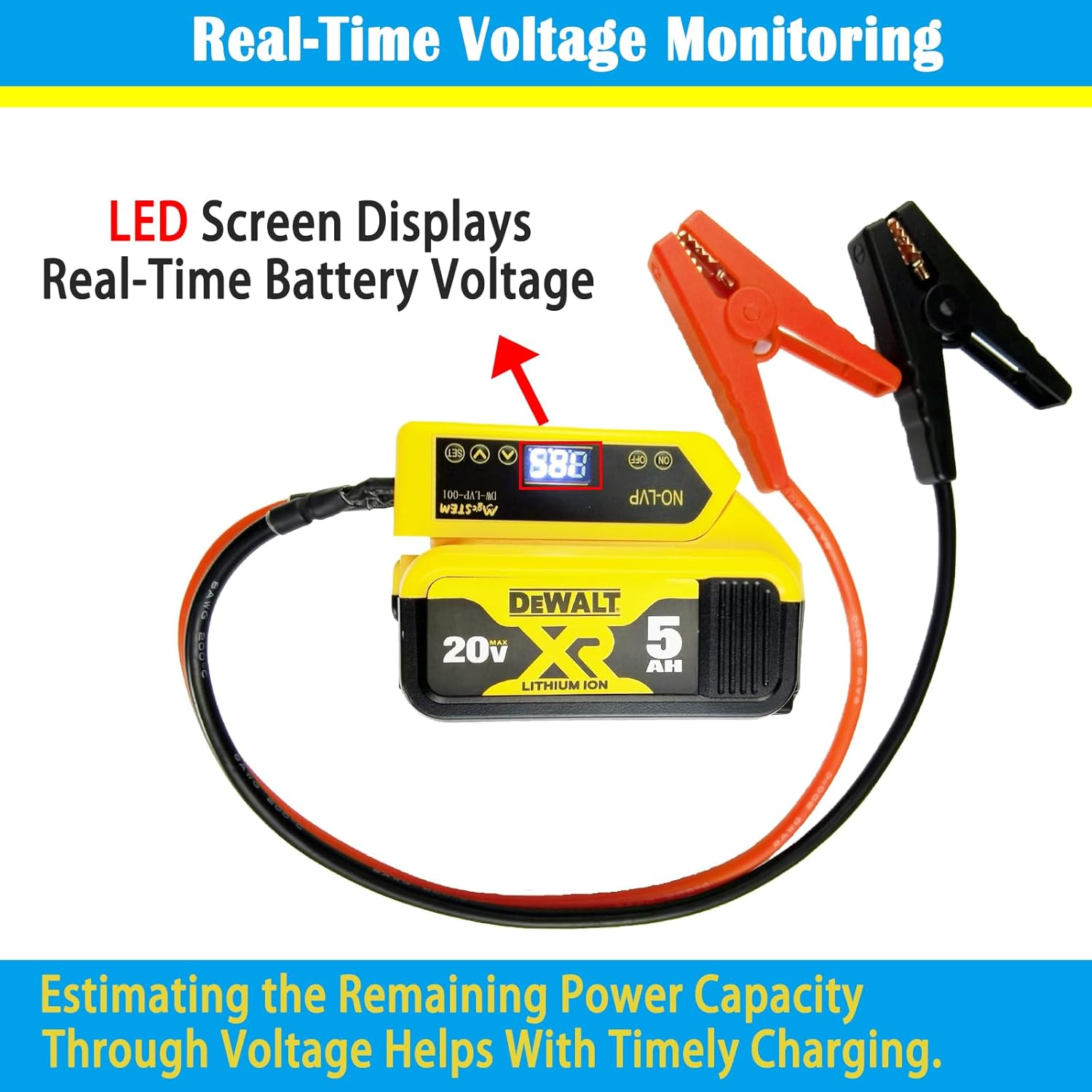 - ăReal-time Voltage Display Monitoringă Compatible with dewalt jumper cables have LED screen real-time voltage display monitoring function, allowing you to keep track of the battery level of the battery jumper cable at all times