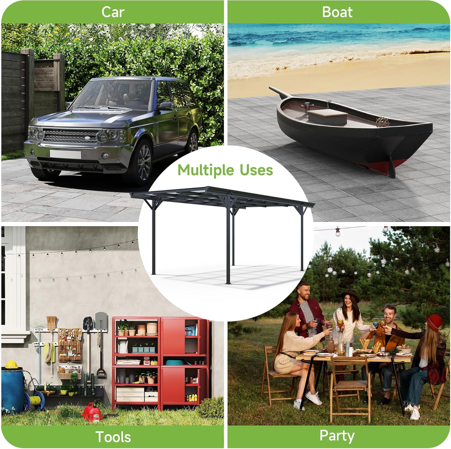- Versatile Carport: Spacious space provides complete covered for cars, trucks, and boats, while easily converting into a shaded outdoor area perfect for gatherings, parties, and commercial events