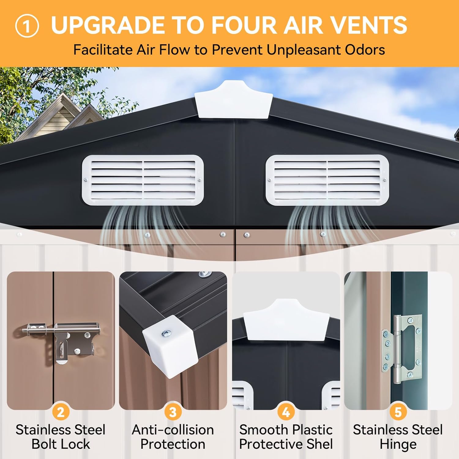 - Sloped Roof & Air Vent: The sloping roof design not only increases the use area, but also prevents rainwater from gathering at the top for a long time. Special design of air vents to prevent any lack of air inside. Pad-lockable doors give easy access to your stored items and enhance the safety