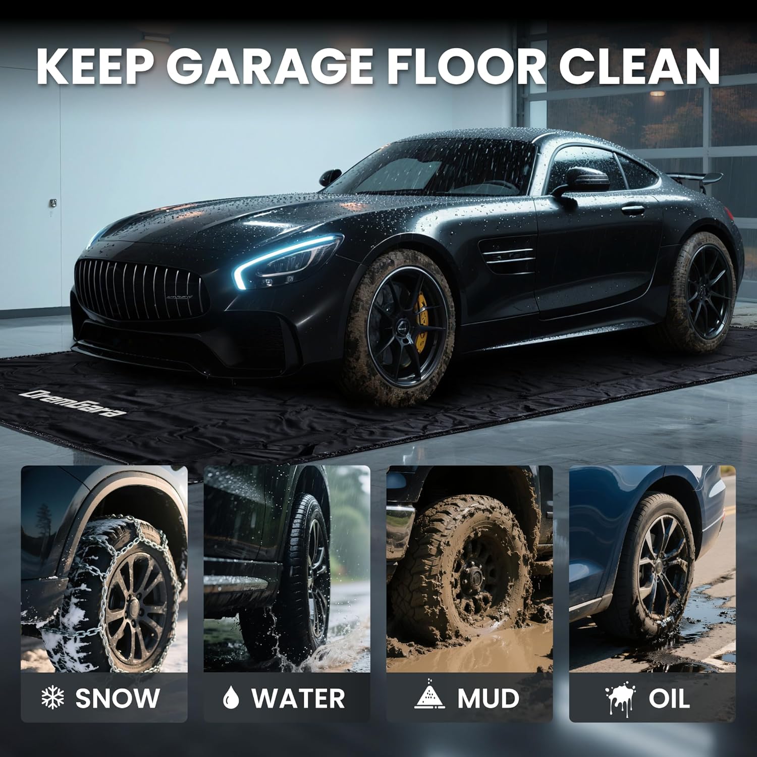 - Easy to clean garage floor mat - heavy duty waterproof protection from snow rain and mud with free floor squeegee included, ideal as a waterproof garage floor mat for under car use