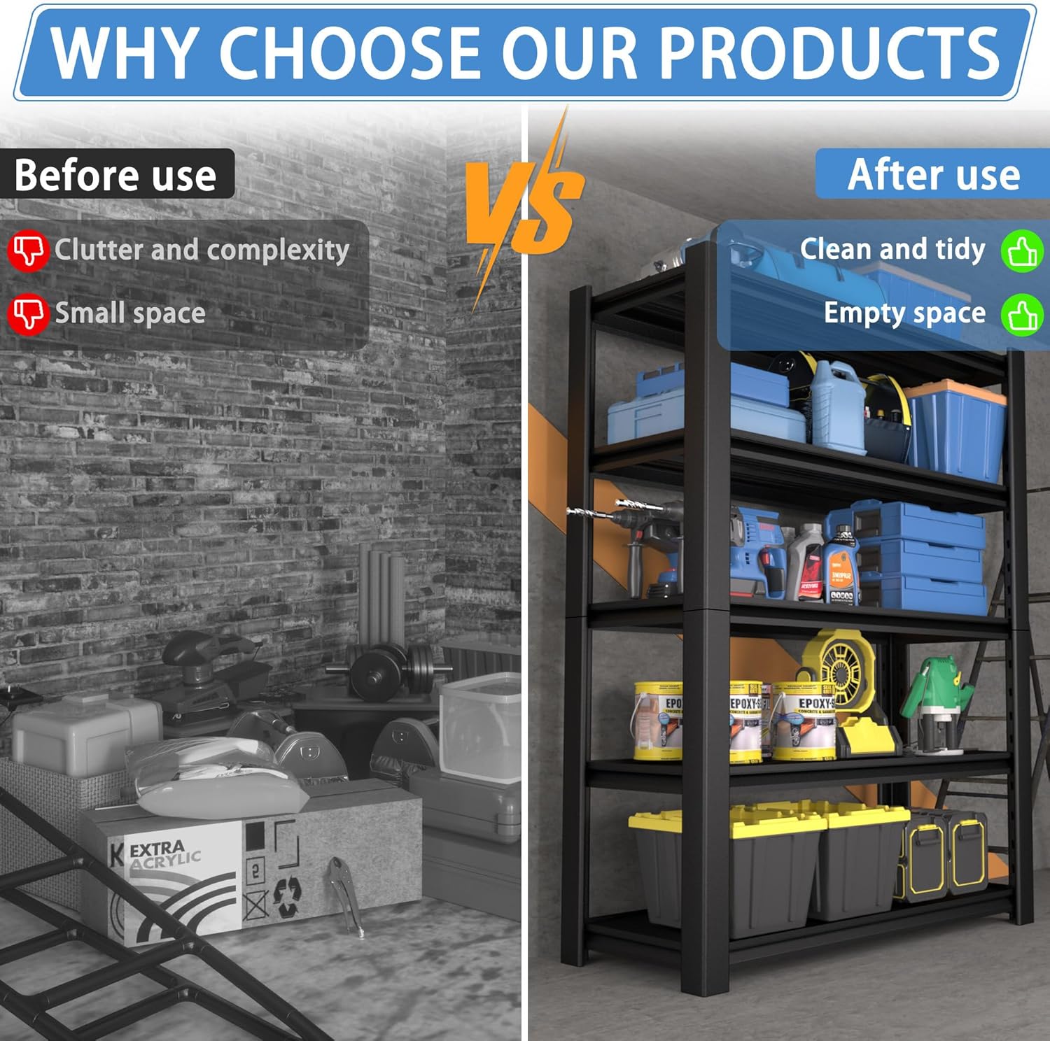 - Heavy-Duty Steel Construction & High Capacity: Built with industrial-grade metal, the Nexvrtau shelving unit supports extreme loads on each of its 5 tiers. The heavy-duty steel frame and reinforced beams provide stable storage for tools, equipment, and bins β perfect for garages, warehouses, or any space demanding reliable strength.