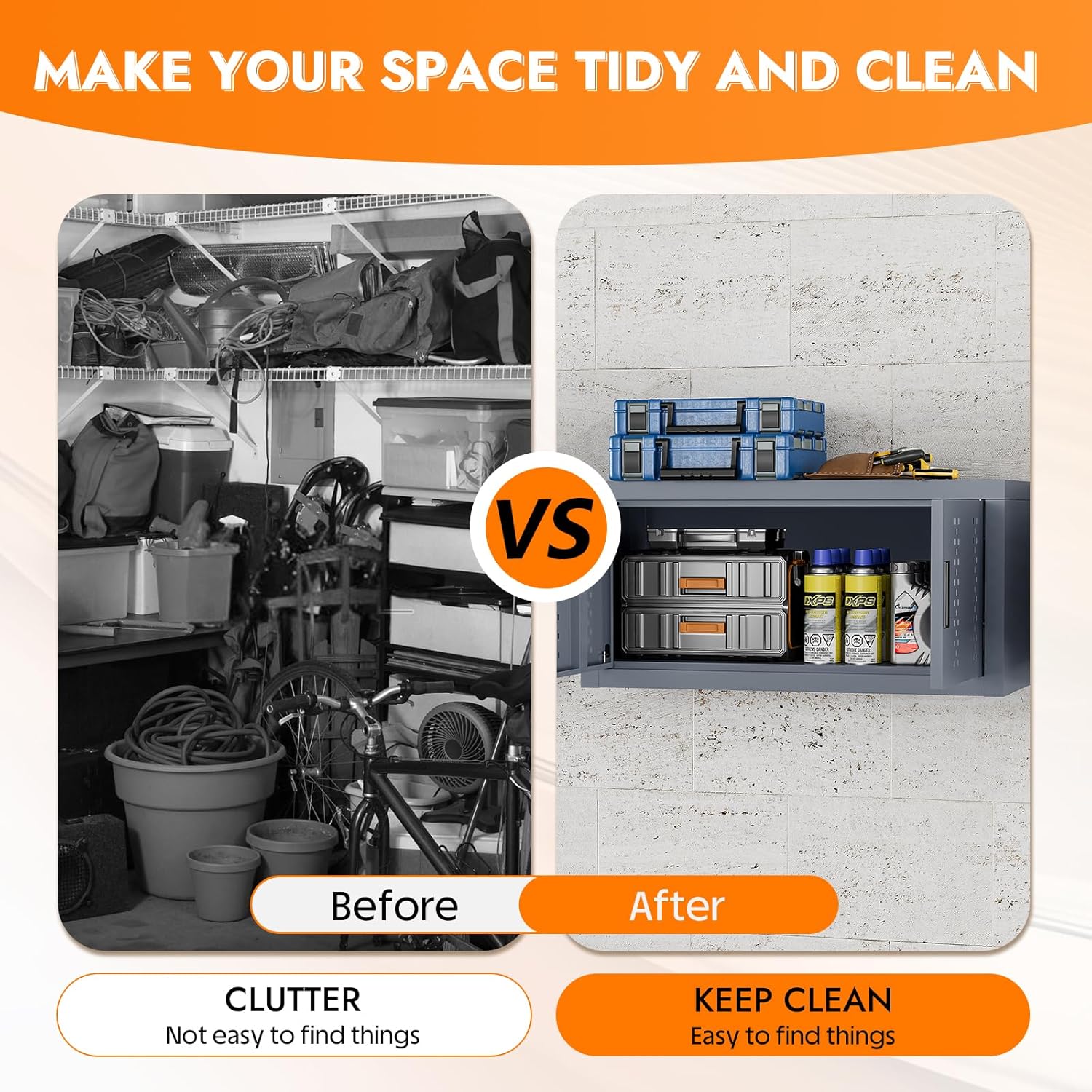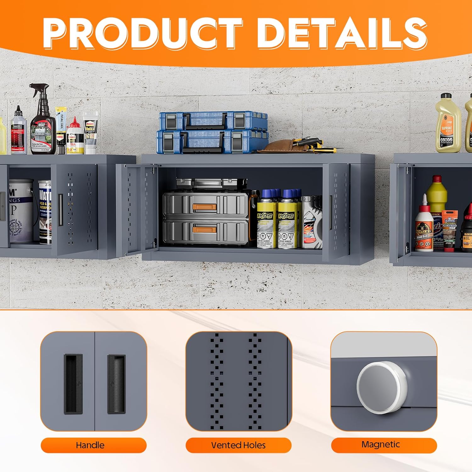 - ăWALL MOUNTED CABINETăOur garage storage cabinet help you save floor space, maximizing storage even in tight areas. They also add a decorative touch and offer flexible use. Perfect for organizing your items in the kitchen, garage, pantry, or laundry room.