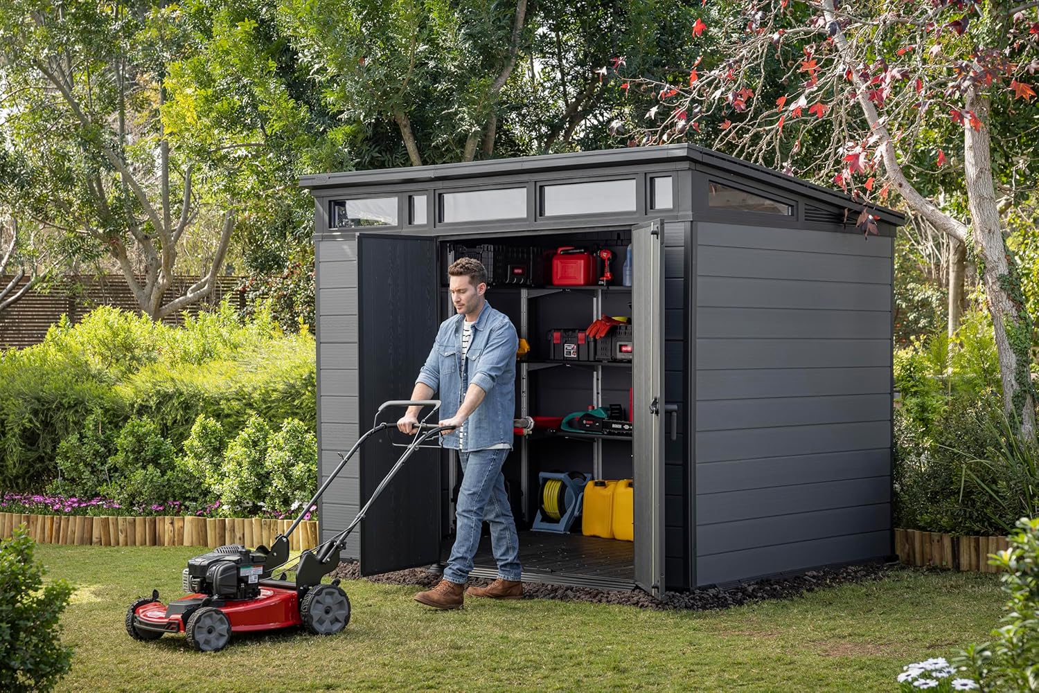 Keter Cortina 9x7 Ft All-Weather Storage Shed with Skylight, Window, Built-in Ventilation, Customizable Walls, & Lockable Double Doors, Graphite