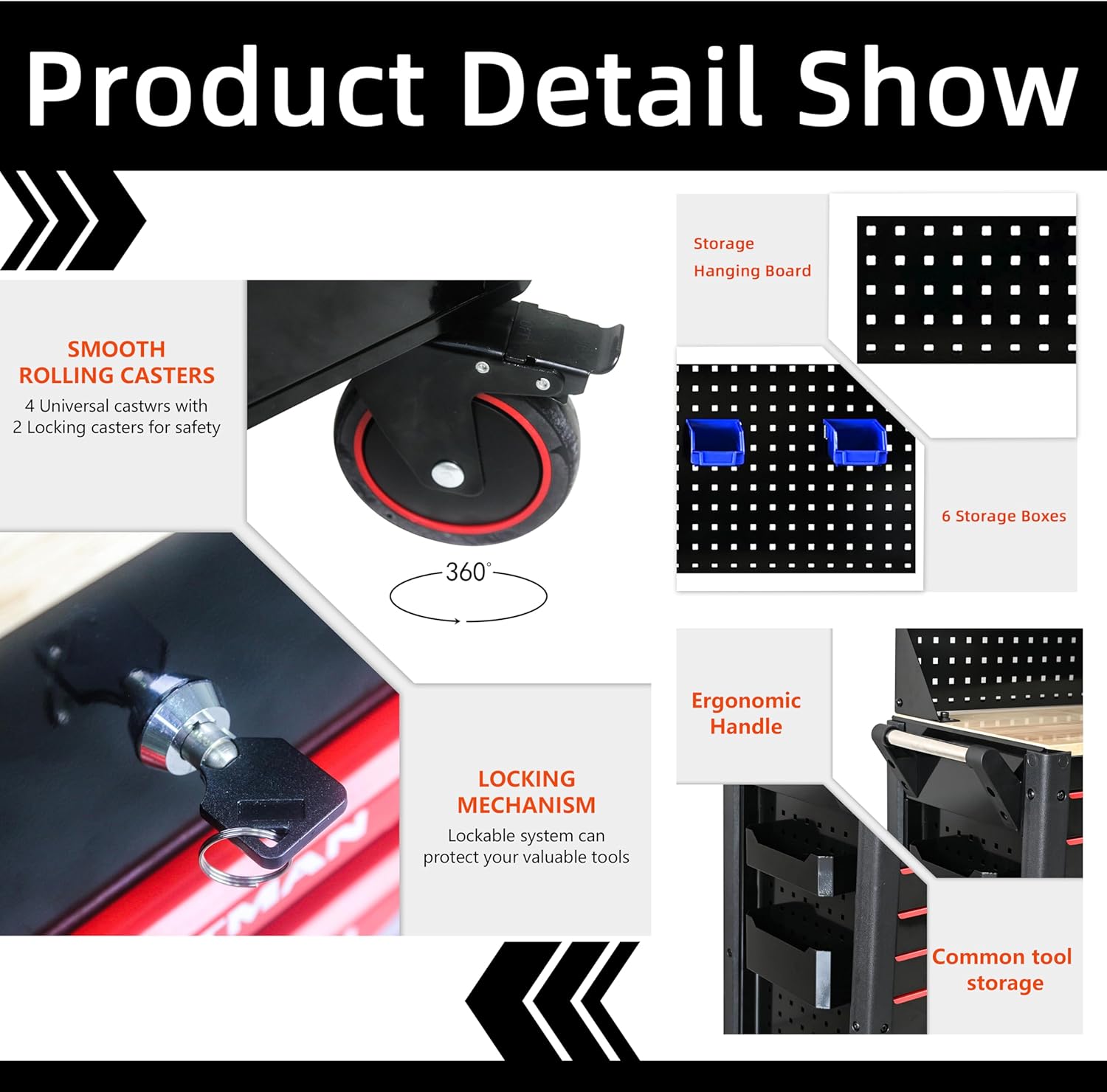 - 【Expansive Storage & Workbench Combo】 Maximize tool organization with this rolling tool cabinet featuring 19 deep drawers compartments.The reinforced top instantly converts to a sturdy workbench with drawers, letting you repair automotive parts or assemble furniture without cluttering your garage floor. Tools stay visible and accessible, cutting search time by 50%