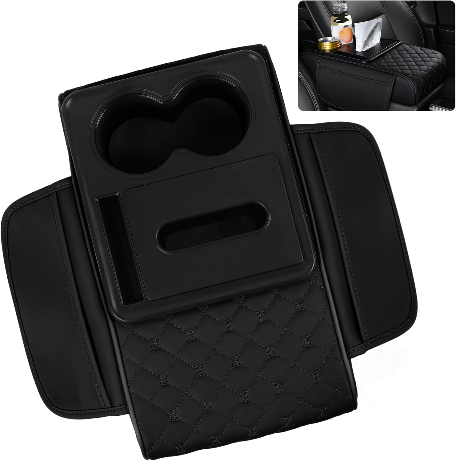 - 5-in-1 Multifunctional Design: Our car center console cover features 2 cup holders (2.8 inches in diameter), or 2 beverages, 1 phone slot (6.4 inches), 1 tissue box (5.3 x 3.5 x 2.4 inches), and 2 side pockets (7.8 x 5.1 inches) for storing keys, coins, credit cards, and other small essentials β all complemented by a supportive armrest pad