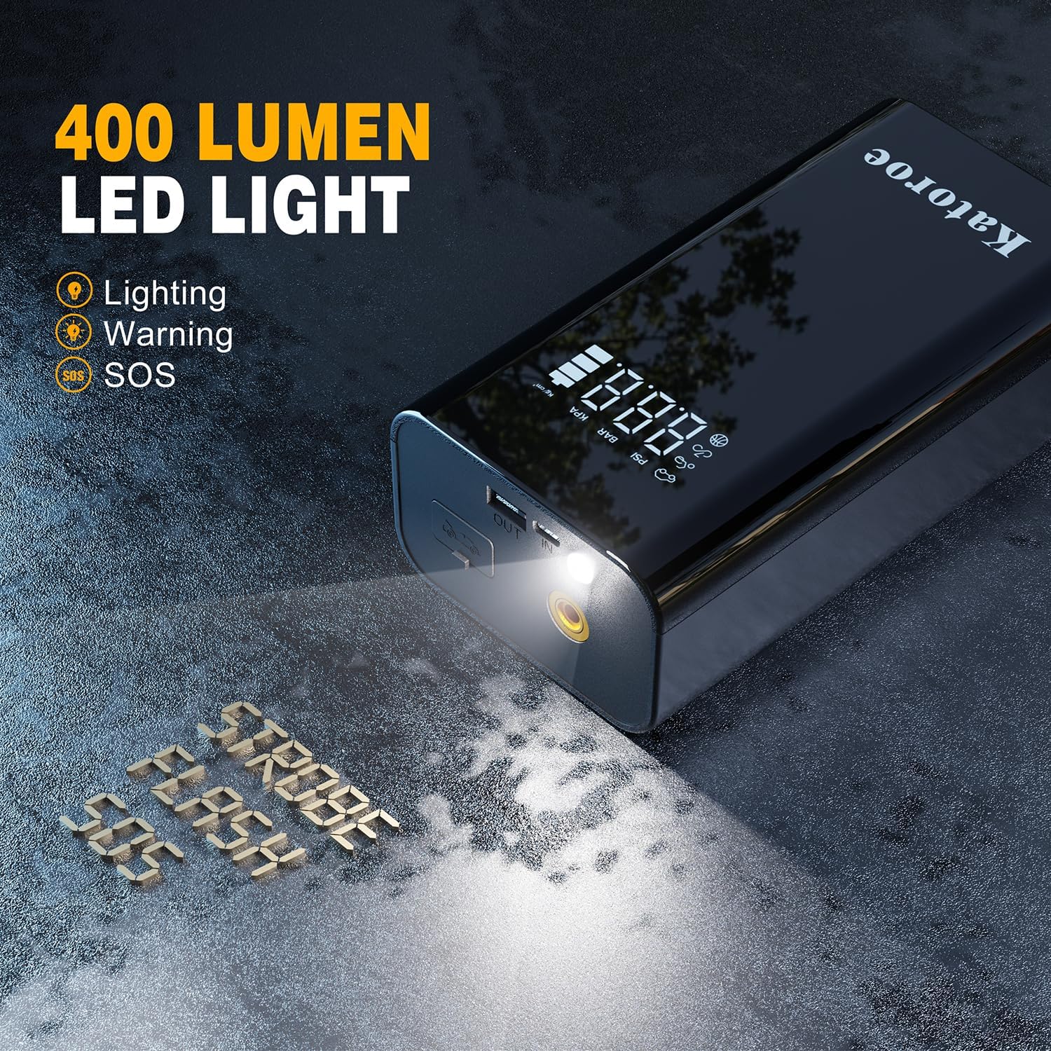 - 【EMERGENCY LIGHTS】The jump starter battery pack is featured with 400 lumens LED lights, significantly providing 300%+ brightness and can be used for long time. 3 modes lights are for different emergency scenarios.