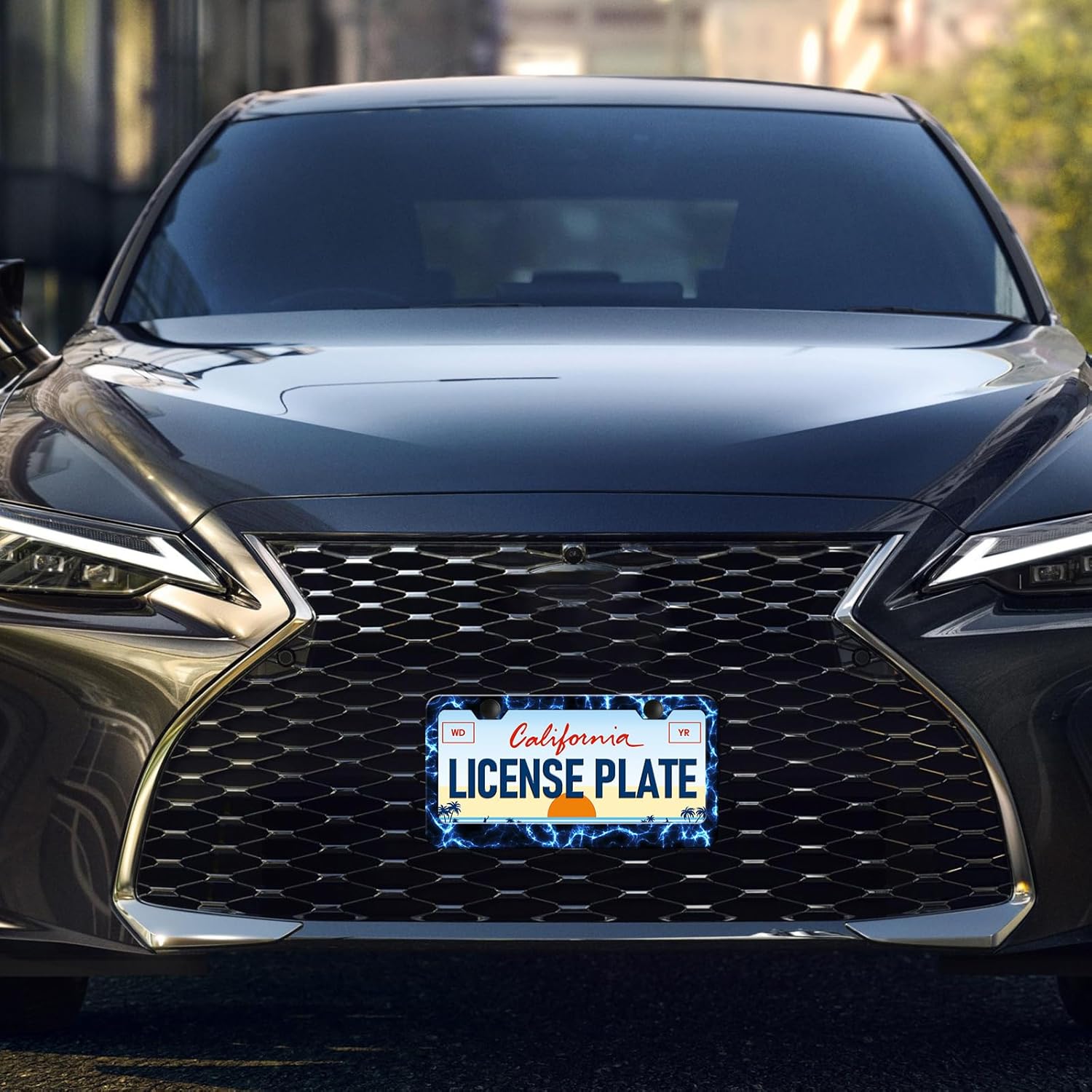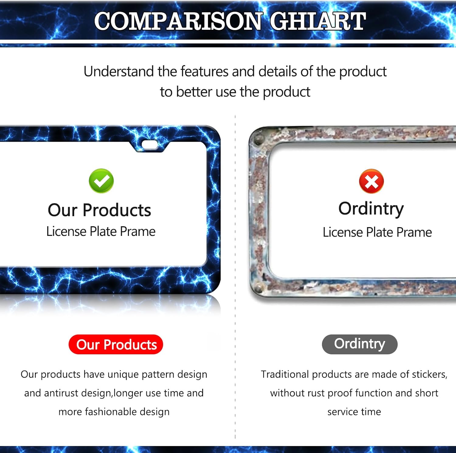 Blue Lightning License Plate Frames - 2 Pack Cool Thunder Stainless Steel License Plate Holder,Rust-Proof Waterproof Car Decorative Tag Frame with Screws Fasteners Caps