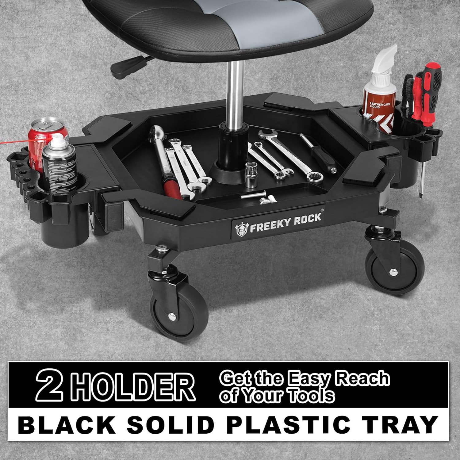 - Enough Stroage Space: The Mobile Rolling Shop Stool is equipped with 1 black plastic storage tray and 2 Cup & Tools side holders. At the same time, we have set up dedicated placement areas for small parts. With ample storage, you can carry your supplies with you while working, like important car care or repair supplies
