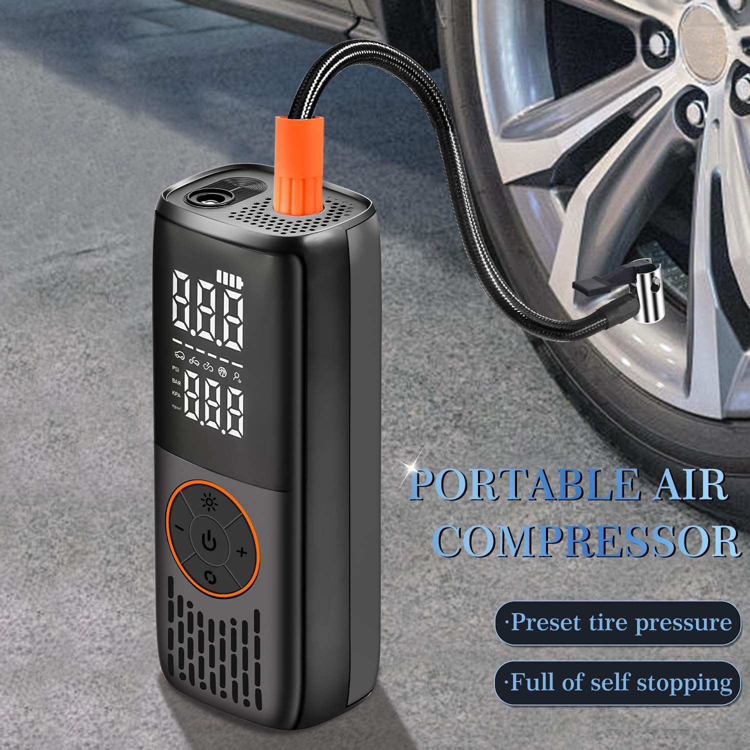 - 【Wide Range of Applications】This portable air compressor features 4 preset inflation modes for bicycles, motorcycles, car tires, and sports balls, making it perfect for everyday use. It also includes a customizable inflation mode for inflating other items like balloons, swim rings, and yoga balls, offering unmatched versatility for home, travel, or outdoor activities. With 4 pressure unit options (PSI, KPA, BAR, KG/CM), it doubles as a reliable digital pressure gauge, ensuring precision and convenience for all your inflation needs.