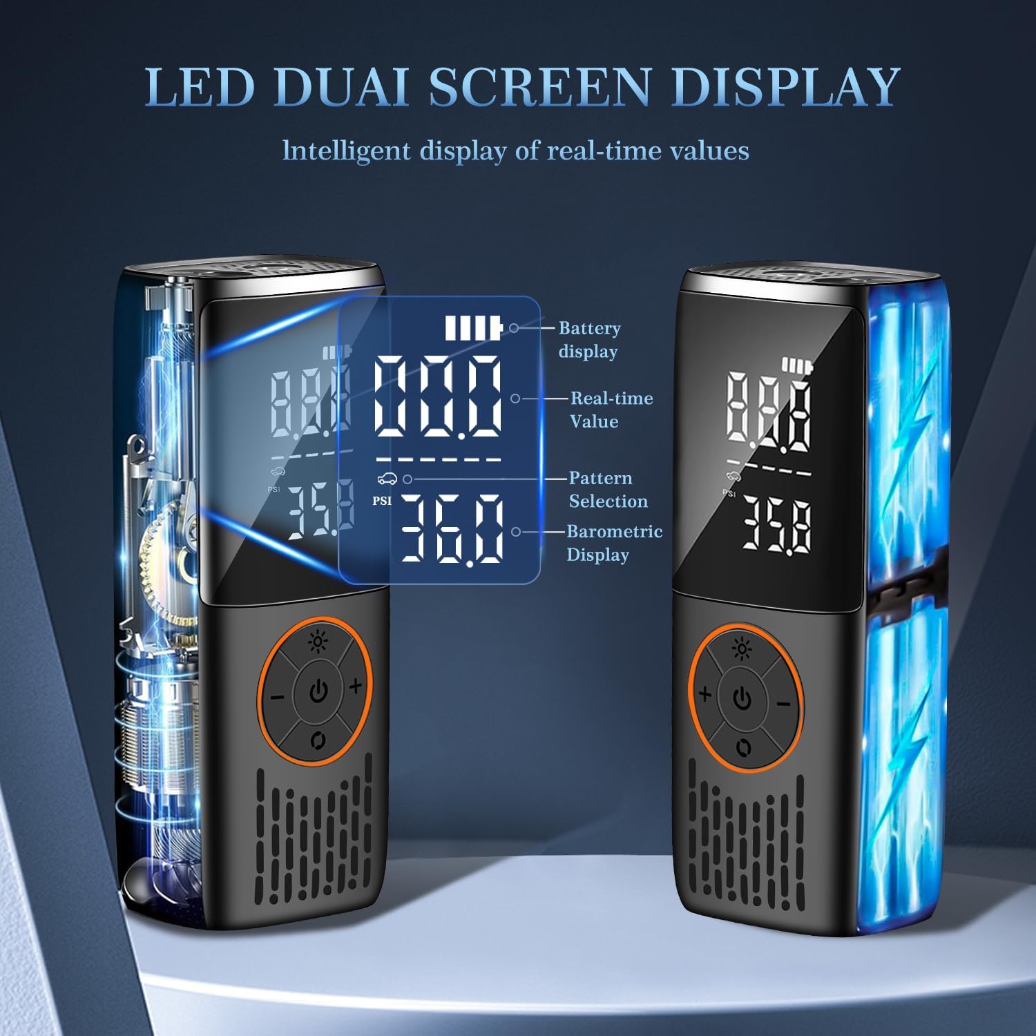 - 【Precision Display & Automatic Shut-Off】Equipped with a high-precision digital pressure gauge and a dual-display screen, this portable air compressor provides real-time monitoring of both current and target pressure values, ensuring accurate and hassle-free inflation. The automatic shut-off feature prevents over-inflation and protects your tires or equipment from damage, making the inflation process safe, reliable, and worry-free.