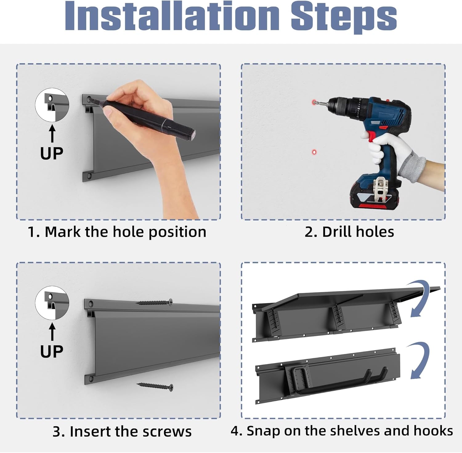 - Flexible and Adjustable Storage: Includes 4 tracks, allowing you to easily position hooks and shelves to create a customized setup that suits your specific storage needs