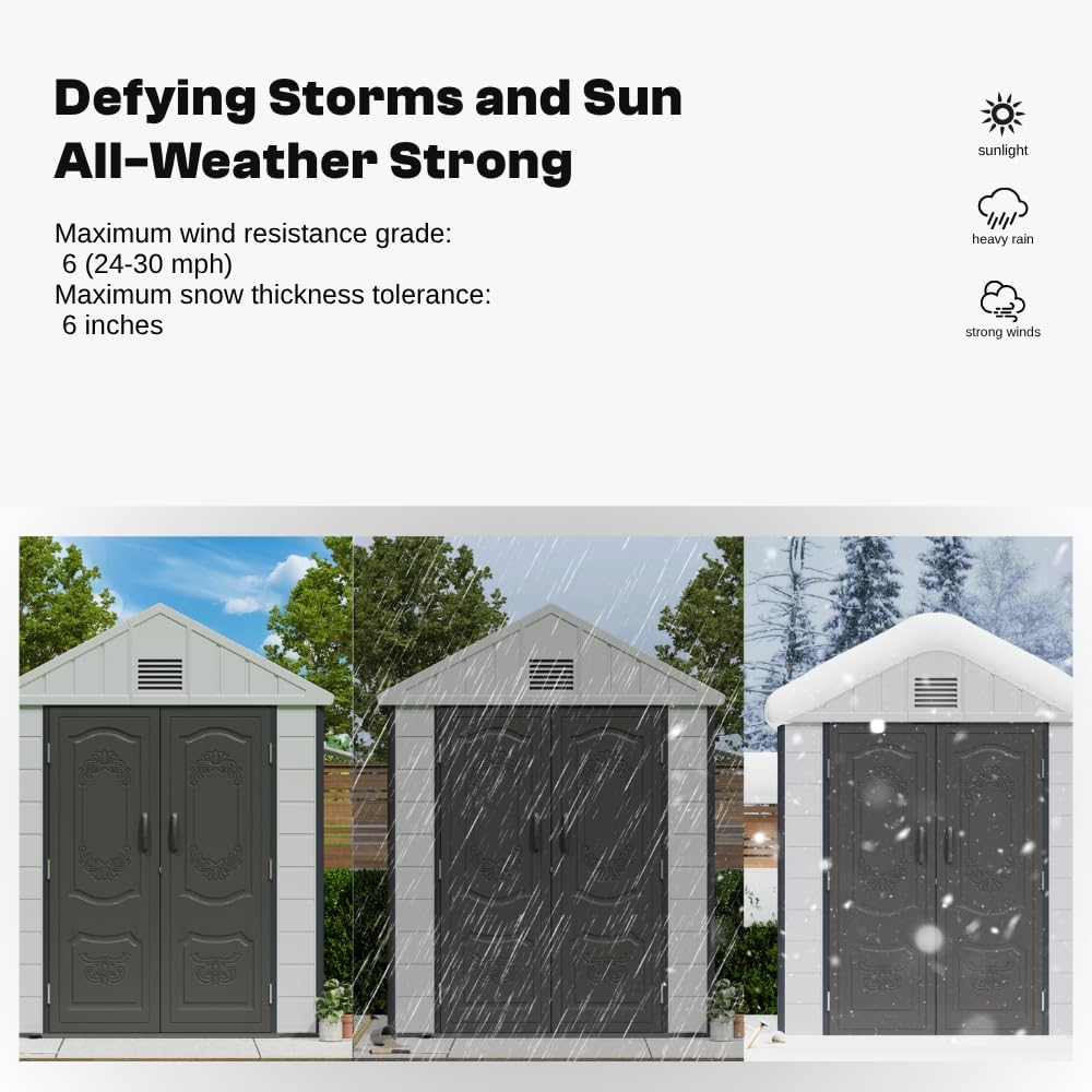- 【All-Weather Resistant Material】Built with fade-resistant, double-wall thermoplastic resin, this storage shed resists cracking, warping, and UV damage even in extreme temperatures (-40°F to 120°F). The corrosion-proof panels and rust-resistant metal frame ensure years of reliable use with minimal maintenance. Additionally, the shed’s sloped roof maximizes interior space while preventing rainwater accumulation, making it perfect for outdoor, patio, backyard, and garden use.
